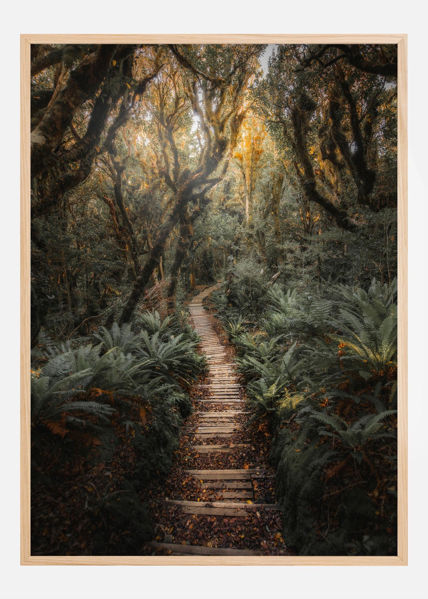 Utforsk naturens fortryllede rike med denne betagende posteren som fanger en mystisk sti slynget gjennom en gammel skog. Dette trykket gir liv til en verden der tiden synes å ha stoppet, der de krokete trærne kledd i mose og bregner i frodige grønne nyanser rammer inn en smal sti av treplanker. Solstrålene trenger gjennom løvverket, og skaper en magisk glød som fremhever skogens skjønnhet og dybde i dens stille løvsal. Denne plakaten er ikke bare et bilde; det er en invitasjon til å vandre gjennom tankens stier og oppdage det ukjente.