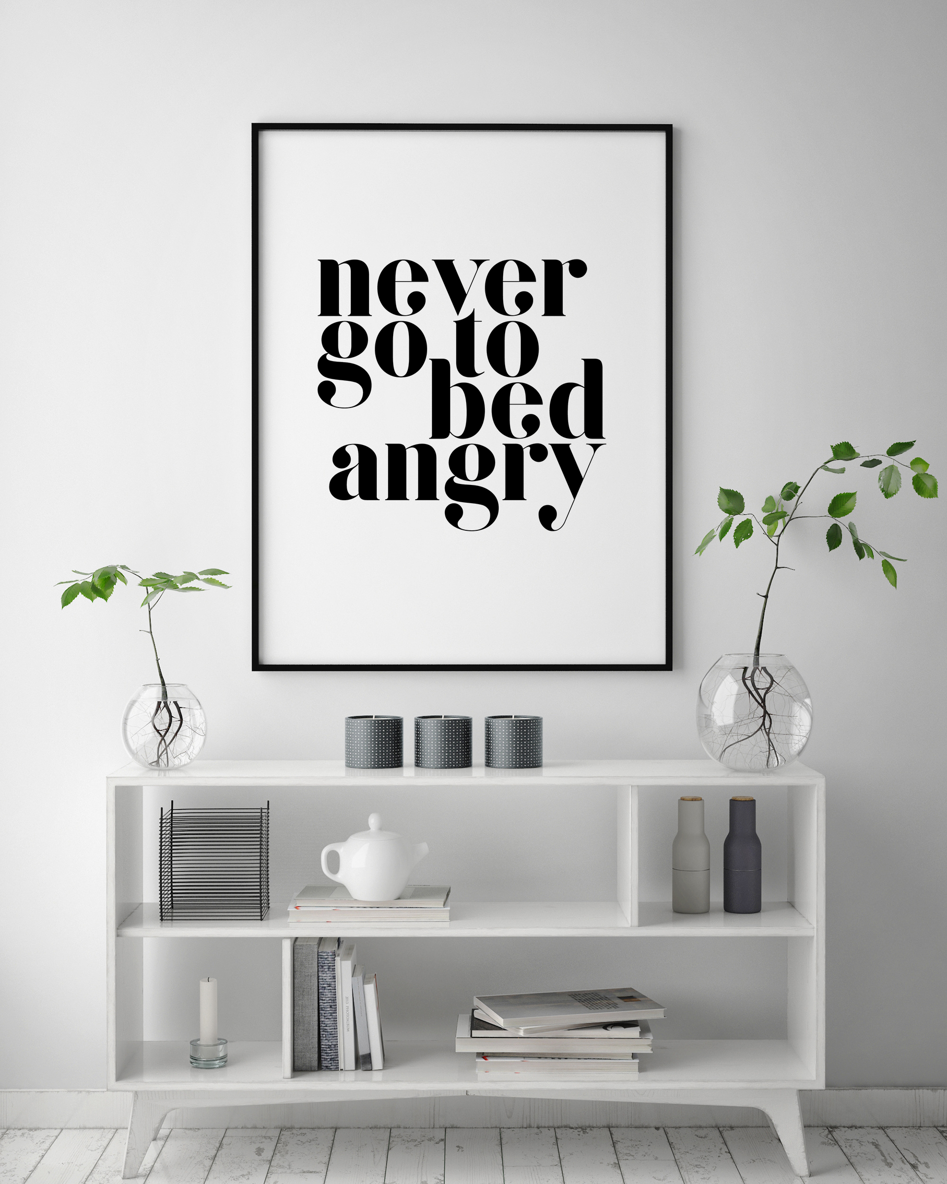 En plakat med den berømte setningen, "aldri gå til sengs sint" trykt med små bokstaver og fet skrift. Skriften er med svart blekk på en hvit bakgrunn. På soverommet ditt vil denne plakaten minne deg alltid om å være fredfull før du sovner. En perfekt plakat for sunn og hyggelig søvn.