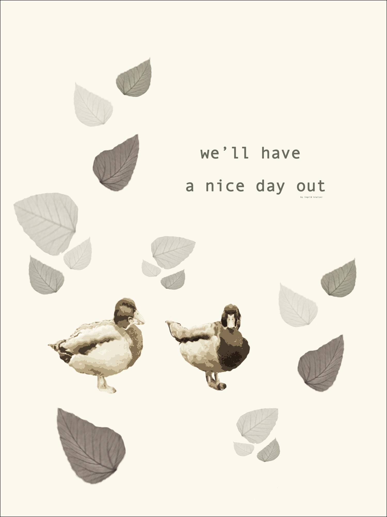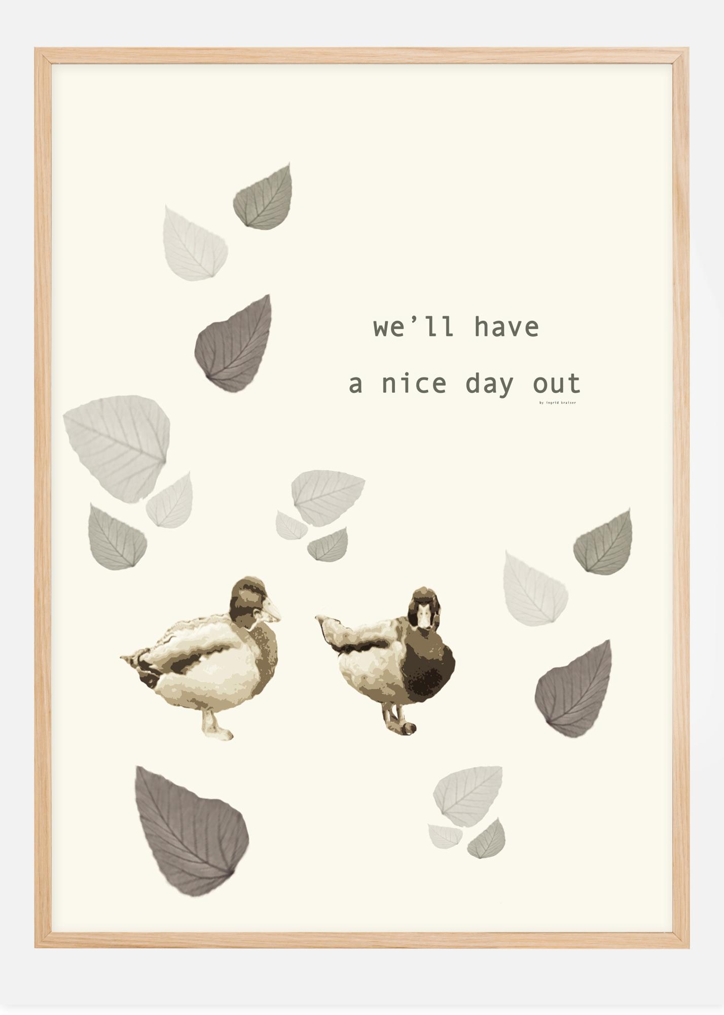 En svart-hvitt-plakat av to fugler, klyngede blader og uttrykket «Vi vil ha en fin dag ute» tegnet perfekt på en hvit overflate. Bladene og fuglene blander seg perfekt sammen, med sine myke beige toner. Den perfekte plakaten for alle som elsker fugler.