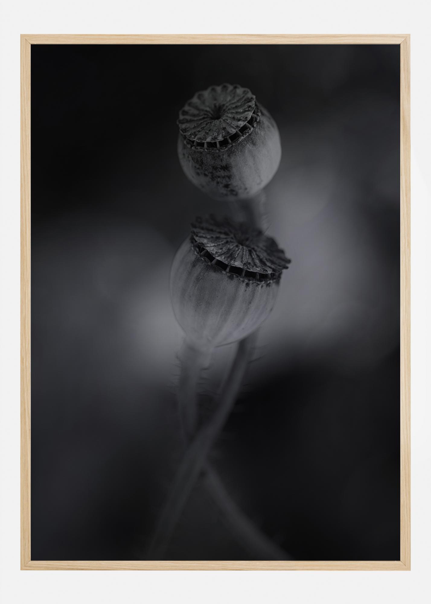 Et utrolig nærbilde i svart-hvitt av to gamle valmuer. De to gamle, sammenflettede valmuene står alene. Det naturlige lyset skaper en uskarp svart bakgrunn, og fremhever valmuenes skjønnhet. Tilfør et snev av ro i hjemmet ditt med denne plakaten.
