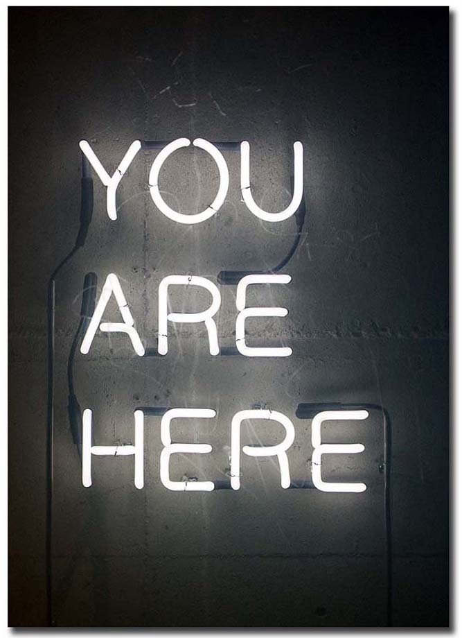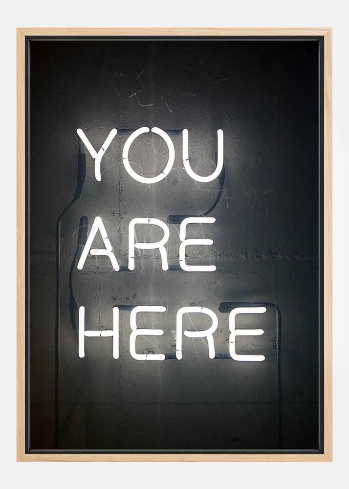 En svart-hvitt tekst poster av et neonskilt med den informative teksten "You are here". En enkel og stilren plakat med et trivelig humoristisk innslag, perfekt å kombinere med andre av våre fantastiske motiver på en større bildevegg.