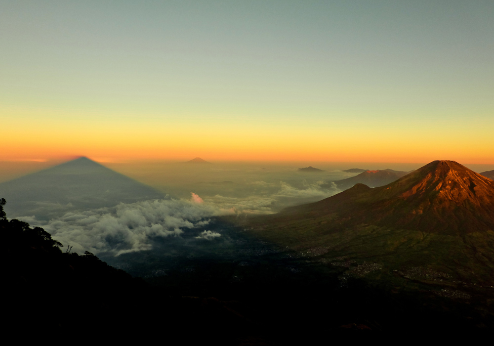 Trykk av en storslagen utsikt ovenfor skyene, over fjelltoppene i soloppgangen. De guloransje tonene i horisonten og den mørke forgrunnen gir bildet en dramatisk stemning og gjør at det fanger blikket. Bildet passer inn i alle innredningsstiler med sitt stilrene bildespråk. Komplementer gjerne med en ramme som passer til fargene i bildet.