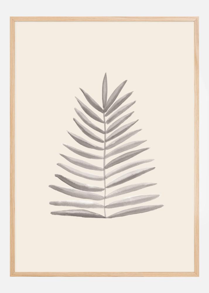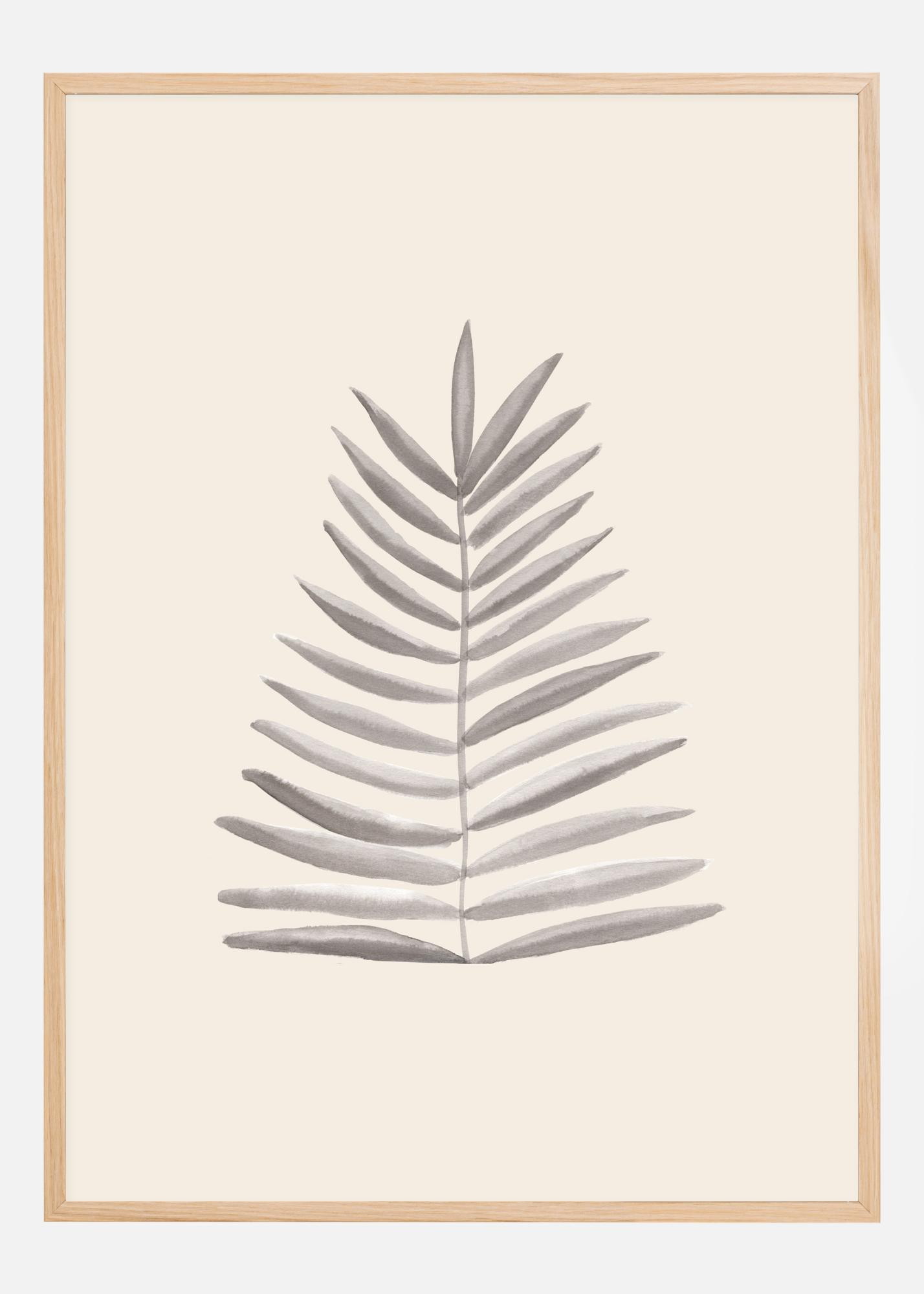 En enkel, men tydelig plakat med et palmeblad. Tegnet på en kremfarget overflate, står bladet oppreist på stilken sin. Den kremfargede bakgrunnen fremhever det lille brune palmebladet. Tilfør et snev av klasse til en farget vegg.