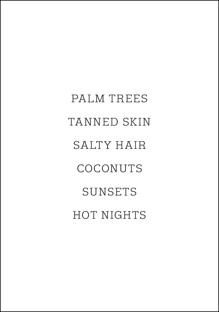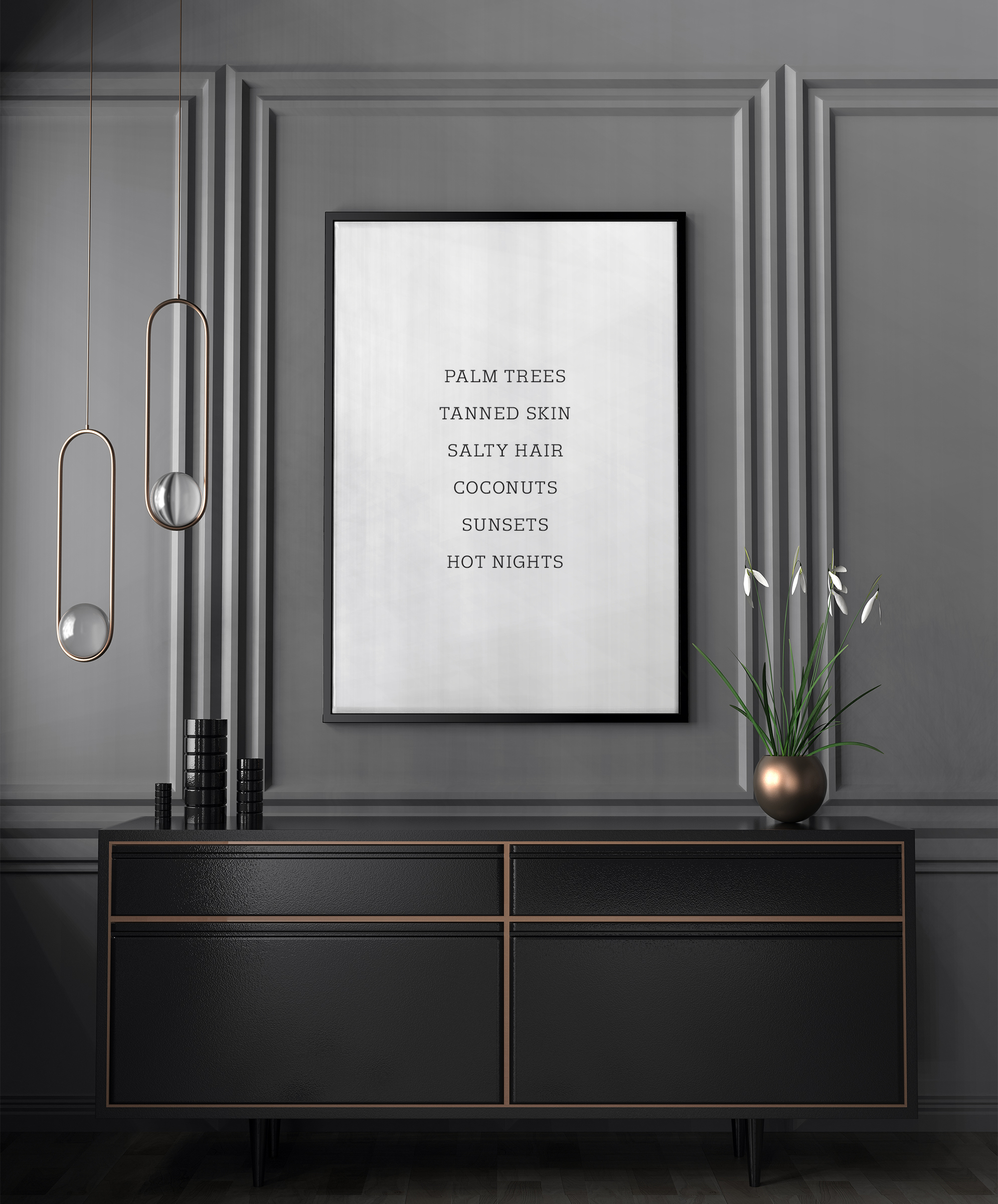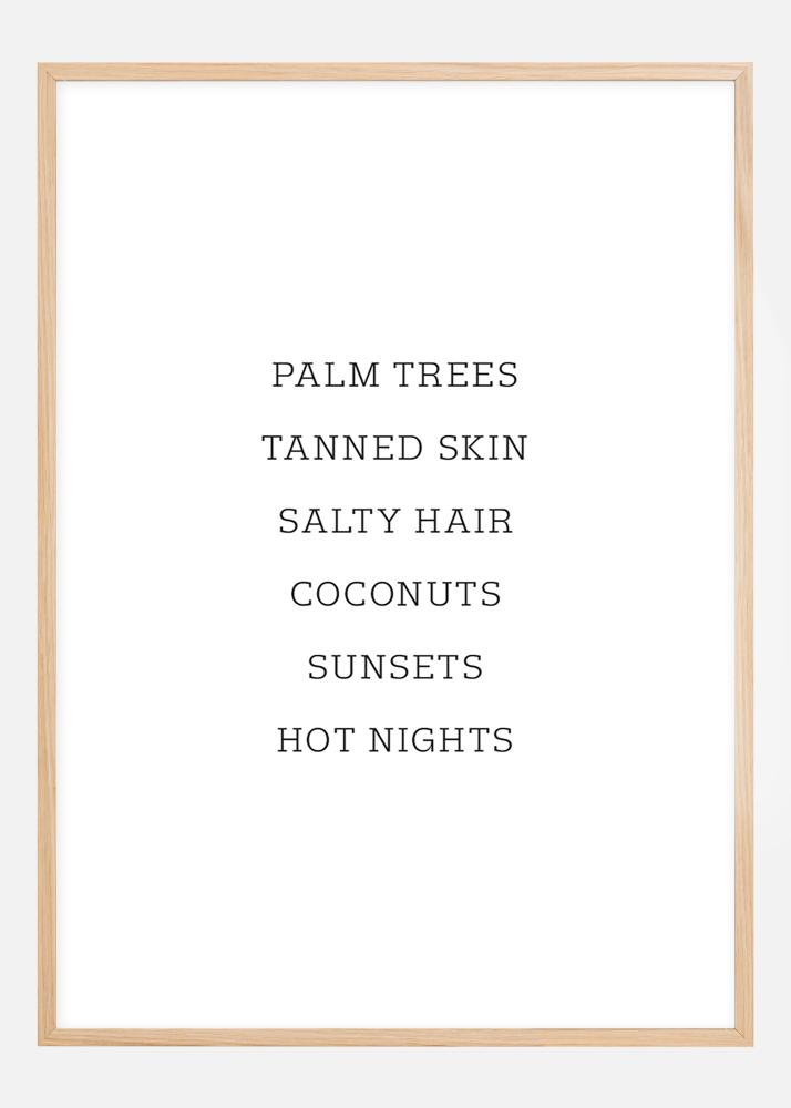 En svart-hvitt-plakat som formidler en sommerlig melding. Med den svarte skrifttypen på en hvit overflate, leser ordene: «Palmer, solbrun hud, salt hår, kokosnøtter, solnedganger, varme netter». De sentralt plasserte ordene minner oss om sommersesongen. Legg til en sommerlig detalj til din moderne stue med denne plakaten.