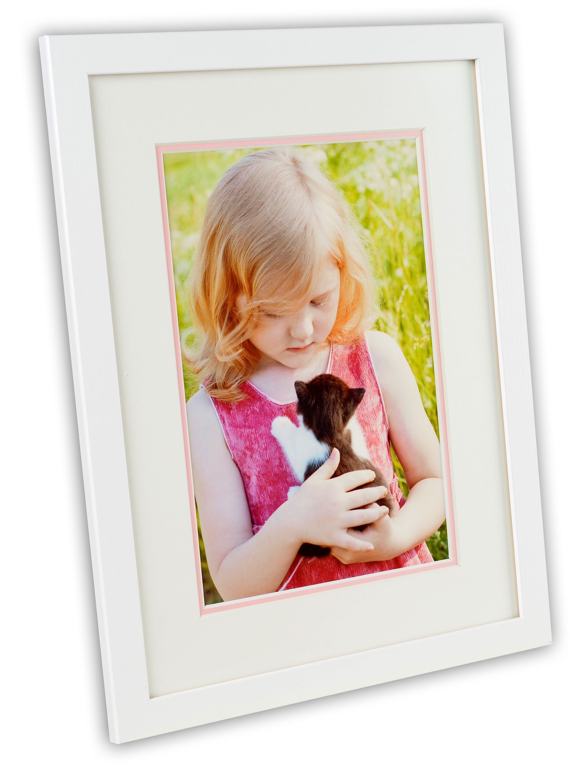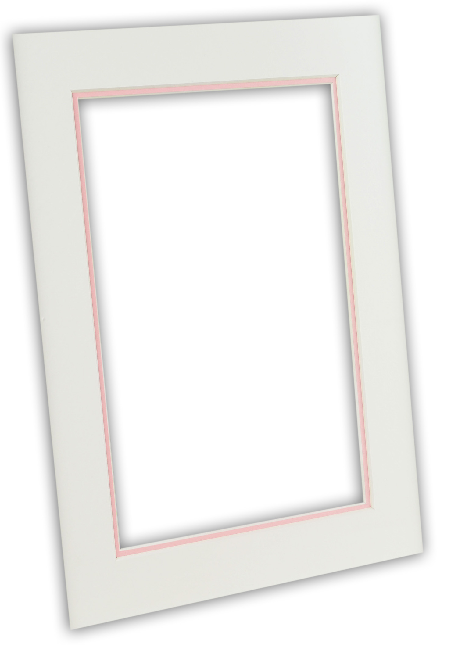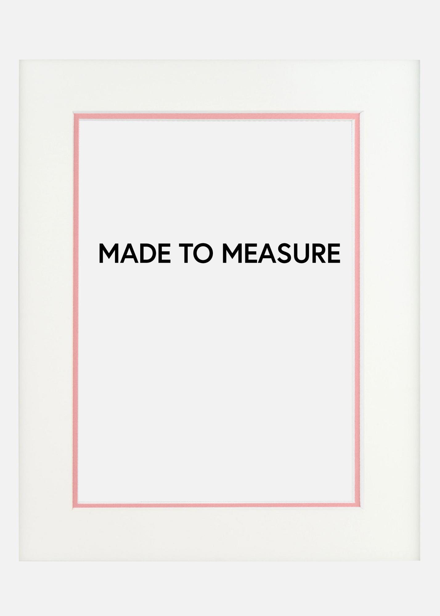 Passepartout bestilt på mål, i to lag med hvit passepartout som base og et underliggende lag i lyse rosa, som gir en farget kant på 5 mm rundt bildene. Perfekt når du ønsker en effektfull innramming som fremhever bildet og gir en ekstra dybde til motivet. Alle våre passepartouter har fint skårne kanter i 45 graders vinkel, som gir dine bilder en seriøs og profesjonell innramming.