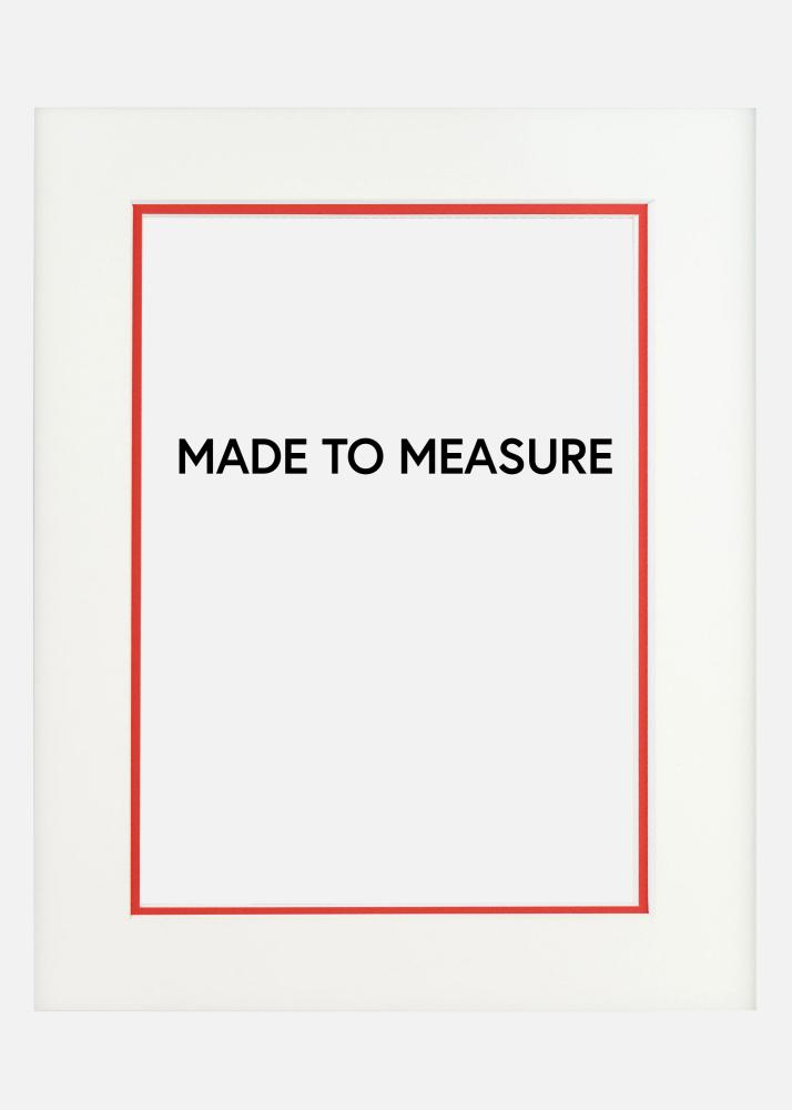 Passepartout bestilt på mål, i to lag med hvit passepartout som base og et underliggende lag i rødt, som gir en farget kant på 5 mm rundt bildene. Perfekt når du ønsker en effektfull innramming som fremhever bildet og gir en ekstra dybde til motivet. Alle våre passepartouter har fint skårne kanter i 45 graders vinkel, som gir bildene dine en seriøs og profesjonell innramming.
