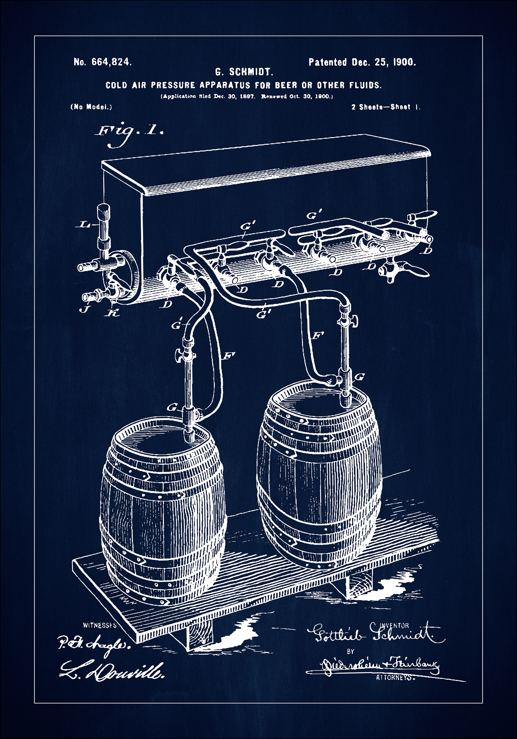 Denne sofistikerte patenteplakaten viser en innovativ design fra den 25. desember 1900, patent nummer 664,824, utviklet av G. Schmidt. Motivet avbilder en kjøletrykkapparat for øl eller andre væsker, en oppfinnelse som revolusjonerte håndteringen og serveringen av drikkevarer. Den nøye detaljerte patenttegningen fremhever systemets komponenter som beholdere, rørledninger og ventilasjonsmekanismer, noe som gjør den til et kunstverk av teknisk briljans. Den svart-hvite illustrasjonen mot den dypblå bakgrunnen gir en estetisk tiltalende kontrast som fanger øyet og inspirerer sinnet.