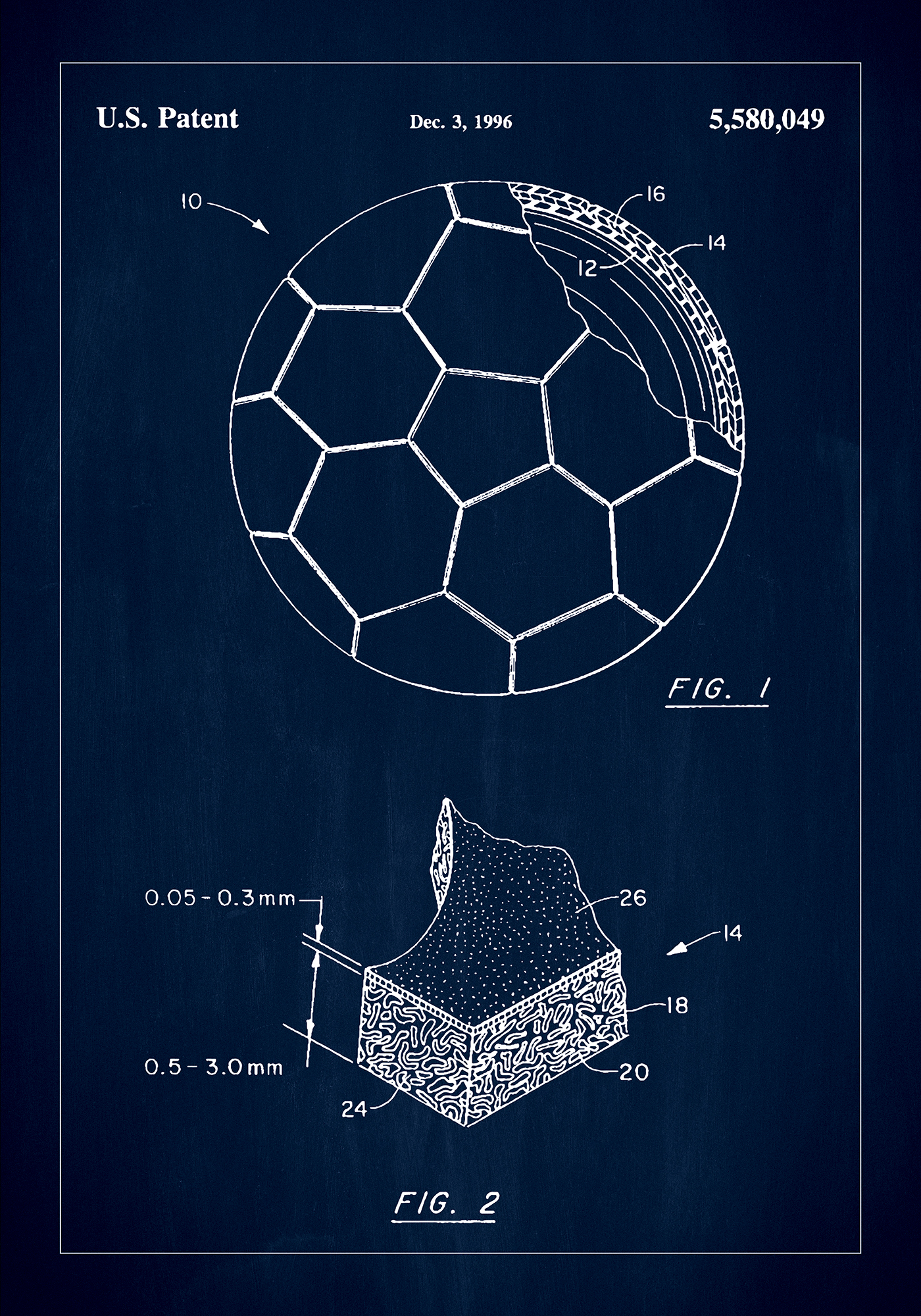 Denne elegante patentplakaten fremviser den presise kunstneriske gjengivelsen av U.S. Patent 5,580,049, som offisielt ble registrert den 3. desember 1996. Plakaten er en perfekt blanding av teknologi og kunst, og dens monokrome stil gjør den til en tidløs interiørdetalj. Den viser en patenttegning av en fotball i to figurer: den første viser den helhetlige designen av ballen, mens den andre delen gir en detaljert visning av et snitt gjennom ballens overflate, belysende den underliggende strukturen og dimensjonene.