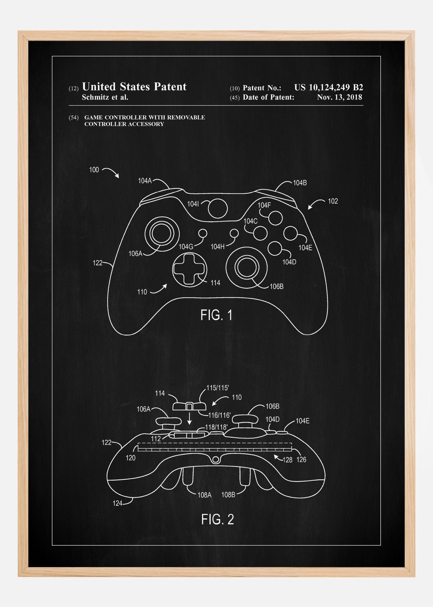 Denne patentposteren med en svart tavle bakgrunn elegant fremhever en moderne spillkontroller til Xbox med avtagbart tilbehør, patentnummer US 10,124,249 B2, datert 13. november 2018. Den avanserte designen og dens komponenter er visuelt fremstilt i detalj, noe som gir innsikt i hvordan teknologi og spillopplevelse kan tilpasses for brukeren. Det er en manifestasjon av den kontinuerlige innovasjonen som skjer innen spillkontrollerens verden.