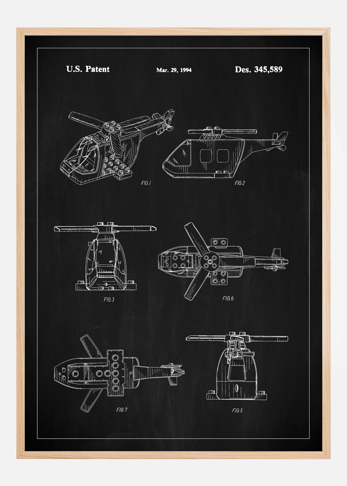 Denne patentposteren presenterer det detaljerte håndverket bak en helikopterdesign fra Lego, som er beskyttet av det amerikanske designpatentet Des. 345,589, gitt den 29. mars 1994. Posteren viser frem en serie tekniske tegninger fra forskjellige vinkler som fanger kjøretøyets dynamiske og komplekse natur. Det er en oppvisning av ingeniørkunst og aerodynamikkens finesser, og hyller de som bidrar til framgang innen luftfartsteknologi.