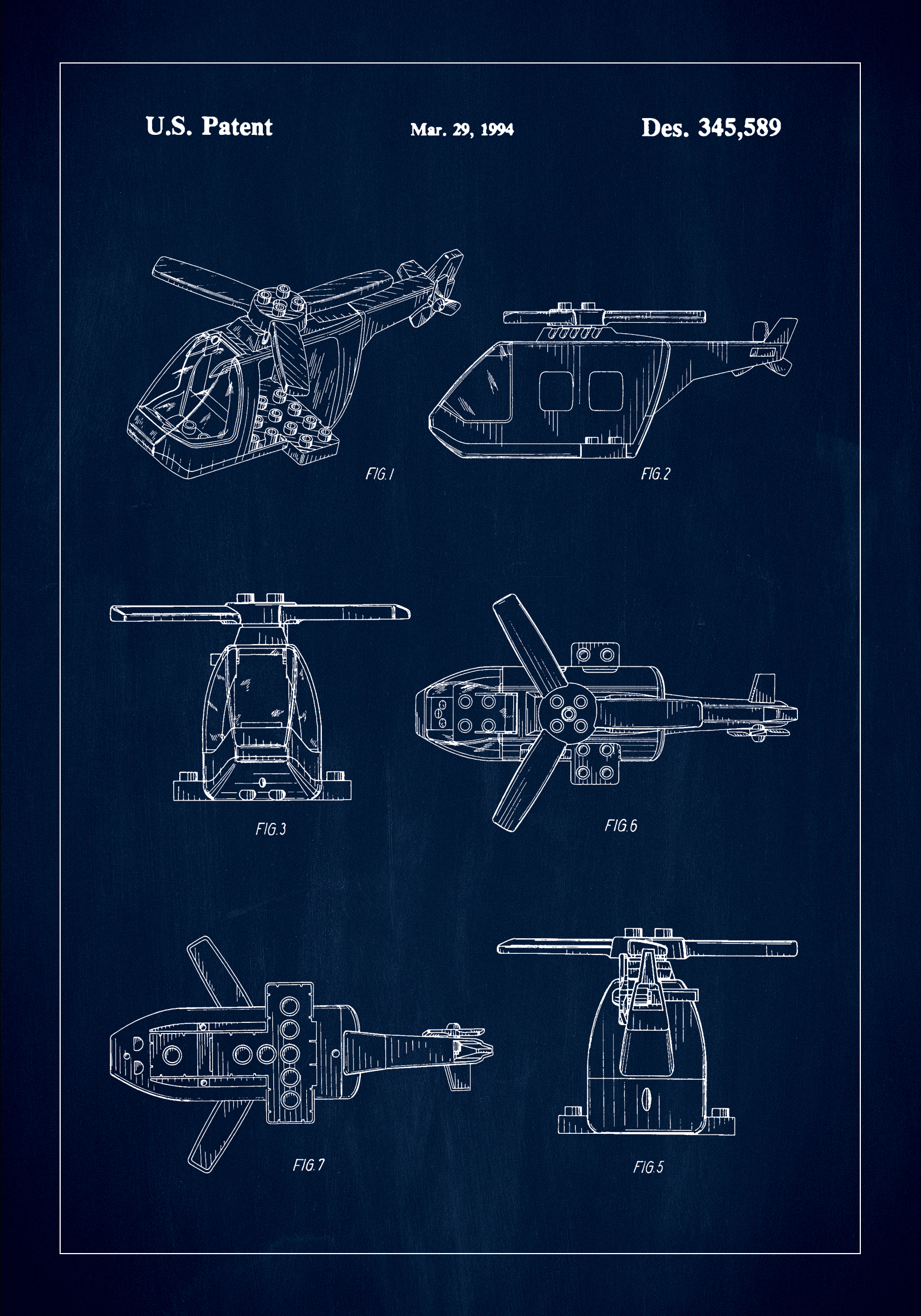 Denne eksklusive patentposteren avbilder det estetiske og funksjonelle mesterverket på en helikopter fra Lego bak U.S. Patent Des. 345,589, datert den 29. mars 1994. Med en dyp marineblå bakgrunn som kontrasterer vakkert mot de hvite linjene, fanger denne patenttegningen essensen av avansert ingeniørkunst og design. Den er en hyllest til innovasjon og er ideell for de som verdsetter teknisk finesse og historisk innflytelsesrik design i sine interiørvalg.