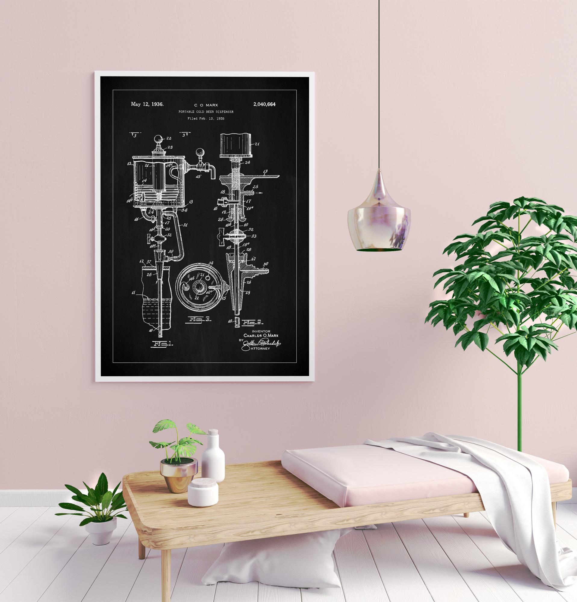 Denne patentplakaten er ikke bare en hyllest til historisk ingeniørkunst, men fungerer også som en unik og samtalestartende veggdekorasjon. Hver nummererte del av den bærbare øldispenseren er tydelig uthevet, noe som fremhever oppfinnelsens kompleksitet og oppfinnerens geni. Perfekt for kontoret, baren eller mancaven, denne plakaten kombinerer industriell sjarm med et hint av klasse, og vil garantert tiltrekke seg oppmerksomheten til besøkende og gjester som setter pris på teknologiens og designens utvikling.