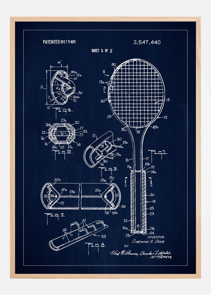 Illustrasjonen er ikke bare en elegant dekorasjon, men også en inspirasjonskilde og en hyllest til oppfinnsomheten innen sportens verden. De eksakte målene og de nøye tegnede detaljene fremkaller beundring for den presisjonen og det håndverket som ligger bak produksjonen av en tennisracket. Dette er en perfekt patenttegning å henge i et spillerom, kontor eller i en sportsbar, for å gi en autentisk og intellektuell følelse til rommet.
