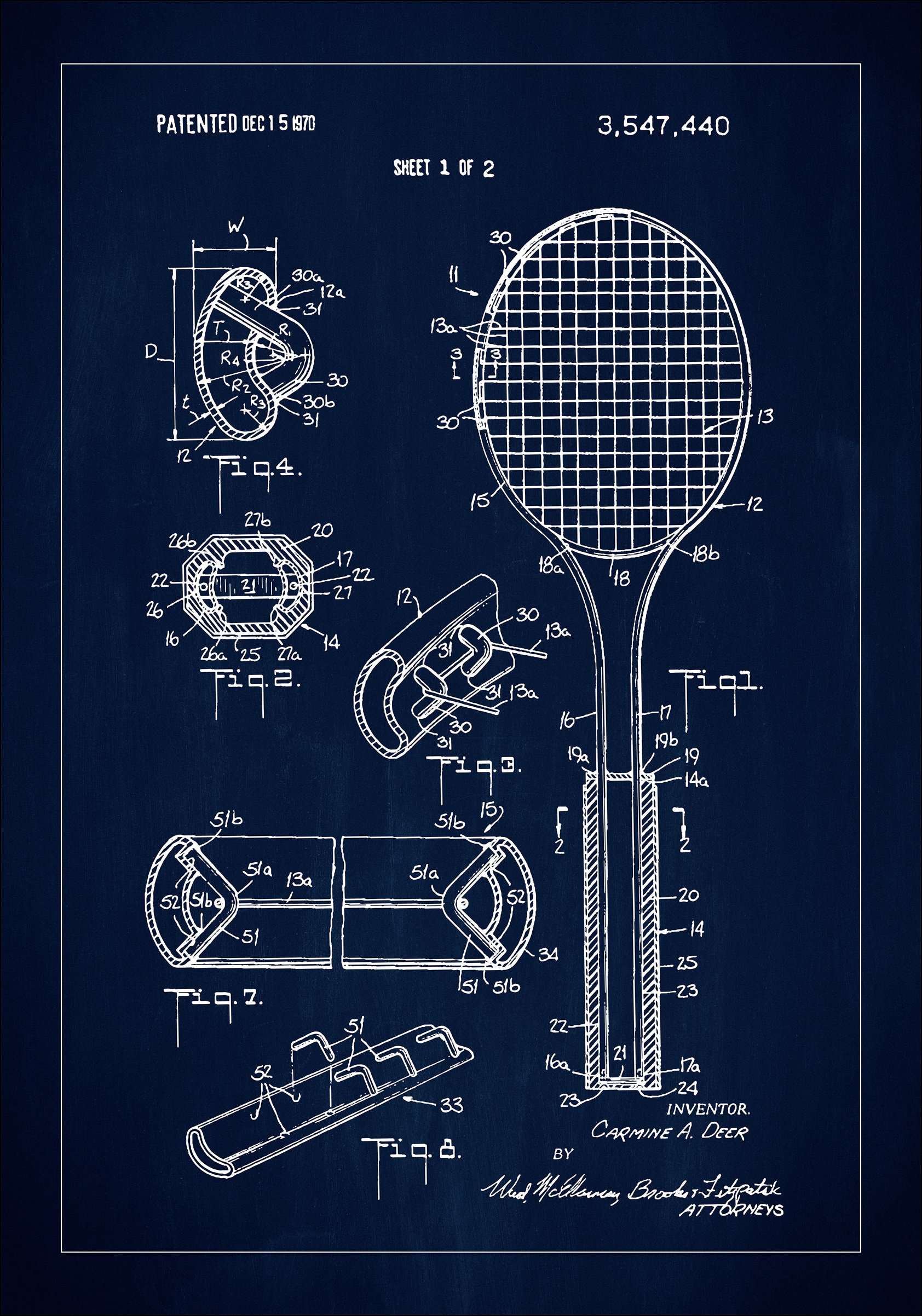 Denne patentposteren gjengir en detaljert svart-hvitt teknisk tegning fra det amerikanske patentet 3,547,440, utstedt den 15. desember 1970. Med dens sofistikerte og industrielle estetikk, viser denne patentplakaten opp den kompliserte designen av en tennisracket og dens bestanddeler, inkludert forskjellige snitt og perspektiver som fremhever innovasjonen og ingeniørkunsten bak sportens utstyr.
