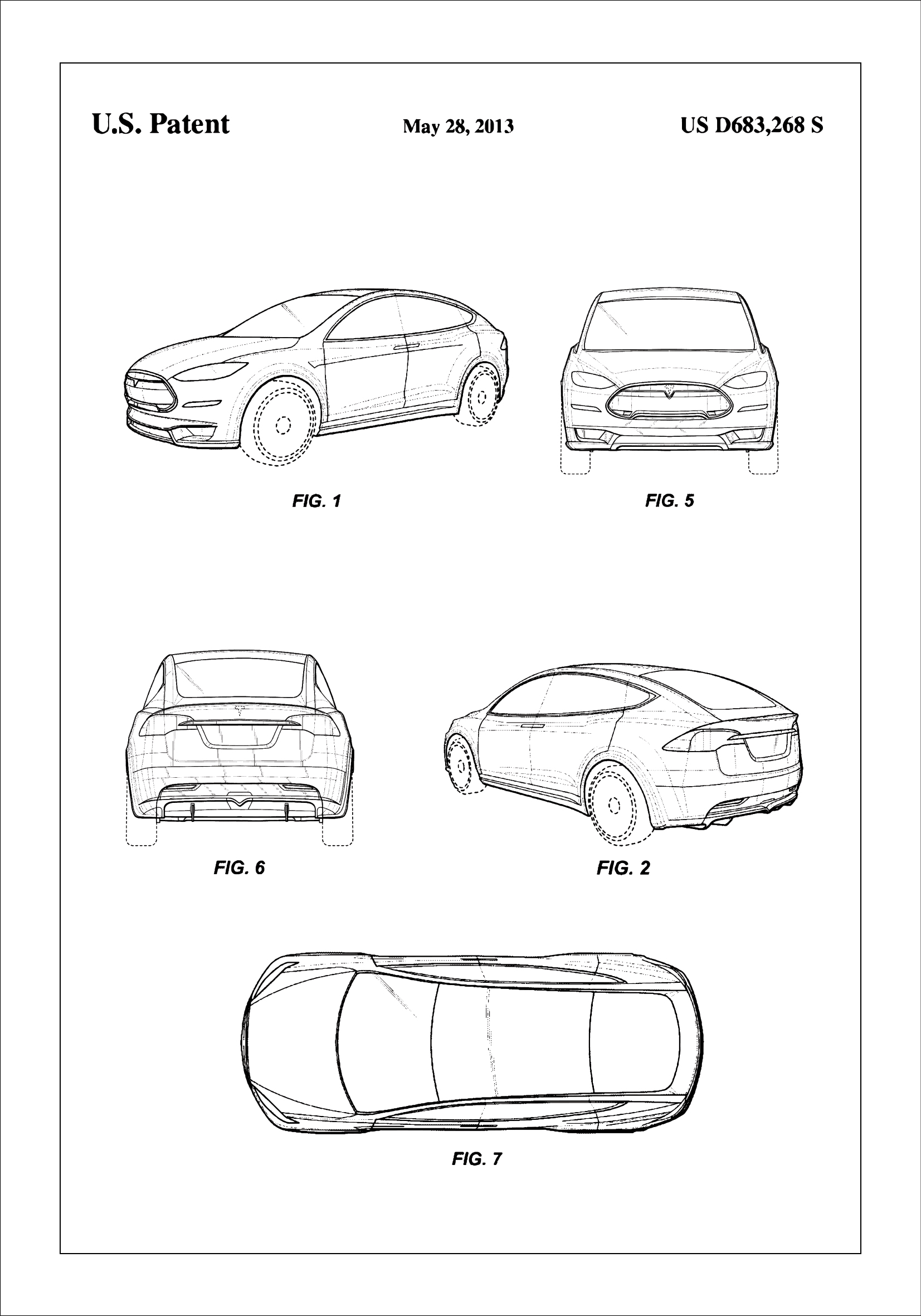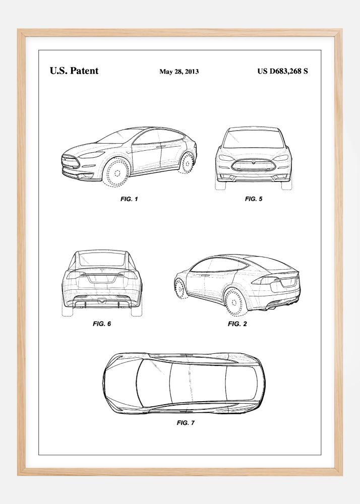 Oppdag en verden av innovasjon og stil med denne distinkte patentposteren av en Tesla, som stolt presenterer patentnummer US D683,268 S, godkjent den 28. mai 2013. Denne minimalistiske og stilrene patentplakaten fremhever et revolusjonerende kjøretøydesign som representerer teknologiens forkant og industriell design. Plakaten fanger blikket med sine skarpe linjer og nøyaktige detaljer, noe som gjør den til en fremtredende interiørdetalj i hvert moderne hjem eller kontor.