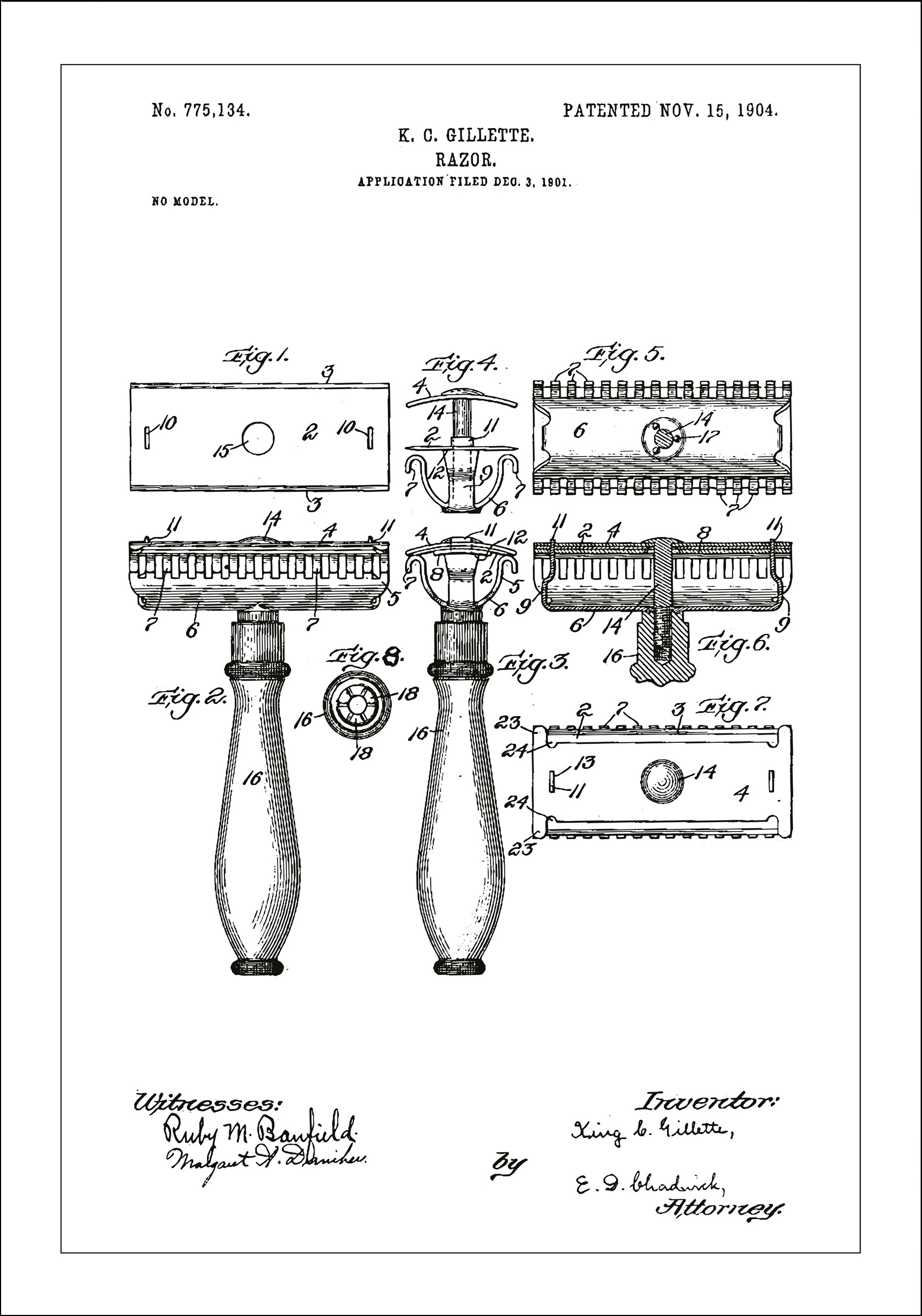 Med en ikonisk og stilren design presenterer denne patentposteren K.G. Gillettes revolusjonerende skapelse: barberhøvelen, patentert den 15. november 1904, patentnummer 775,134. Detaljene i denne patenttegningen fremhever de mekaniske aspektene og nyskapende konstruksjonen som forandret personlig hygiene for all fremtid, og dette ble dokumentert for første gang i desember 1901.