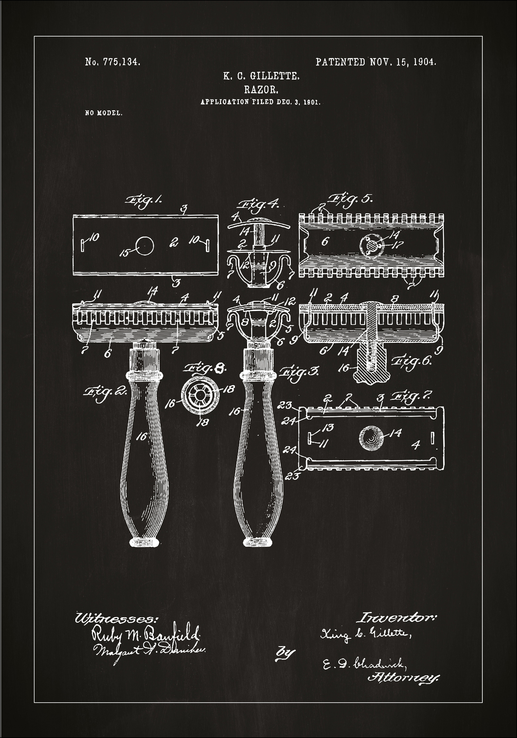 Funderer du på å åpne din egne barbershop eller er du bare fasinert av fine gamle ting? Uansett kommer du sikkert til å like denne fine poster som er en kopi av patenttegningen av en barberhøvel fra begynnelsen av 1900-tallet! I motivet finner du detaljerte illustrasjoner, oppfinnerens navn og en masse annen spennende informasjon som hører til patentet.