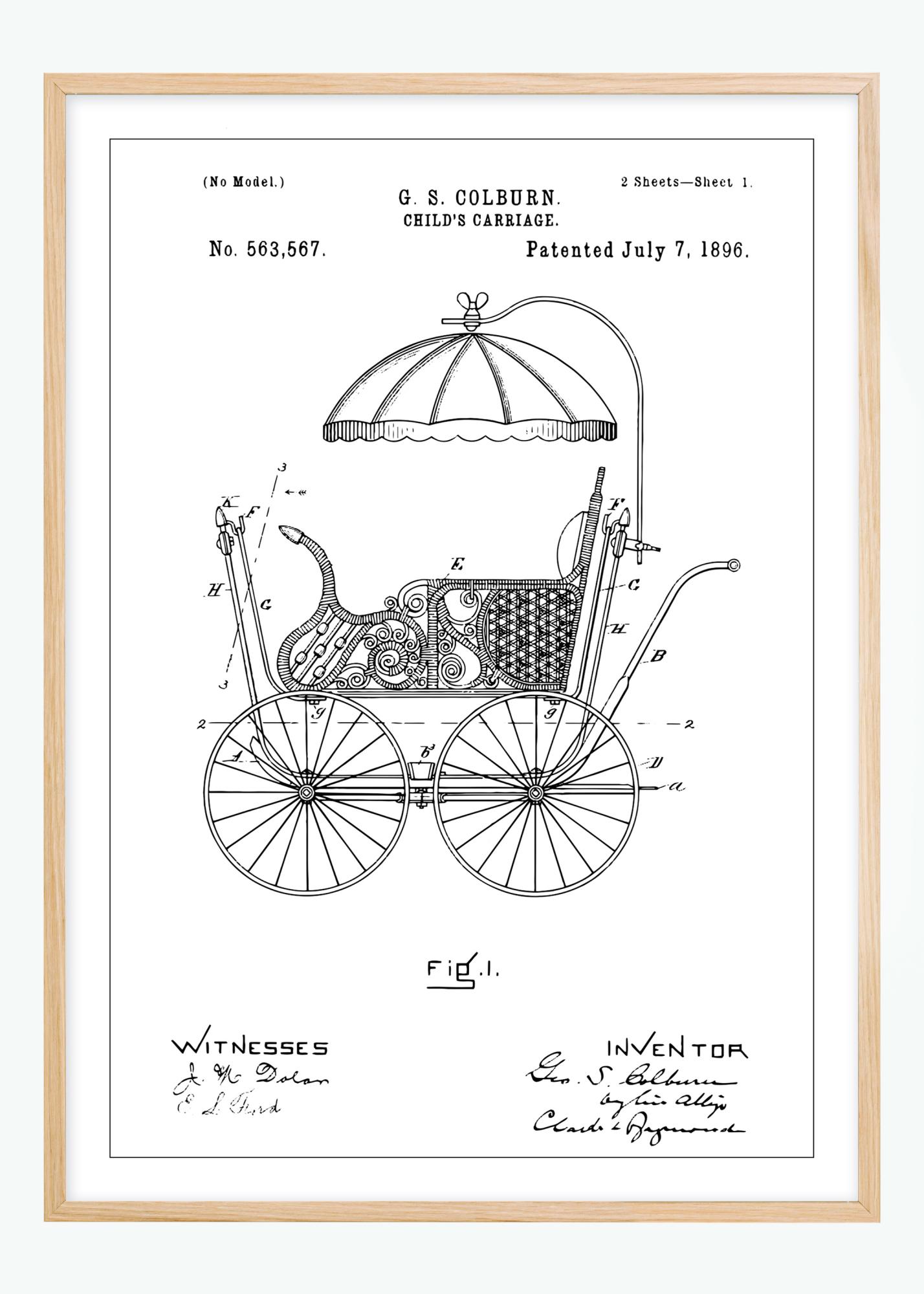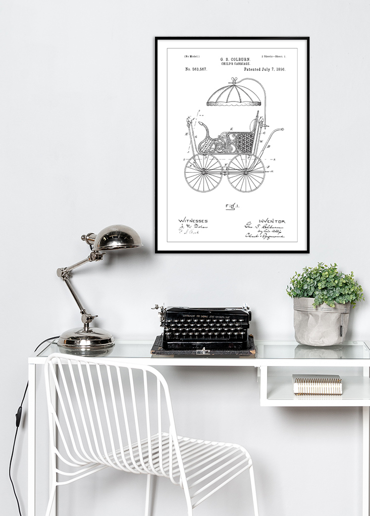 Pynt opp hjemmet med et eksklusivt trykk som forestiller patenttegningen av en lekker barnevogn fra 1800-tallet! Denne vognen, som på 1800-tallet var en topp moderne barnevogn, hadde dekorative detaljer og en praktisk parasoll. Formgiveren George S. Colburn ville med sin oppfinnelse forhindre at barn satt dårlig ved å designe en barnevogn som holdt seg oppreist i alle moduser, og som dessuten hadde en forbedret bremse. Tegningen har nøye utformede detaljer og den blir garantert et flott innslag på veggen din! Øverst kan du blant annet se at patentet ble utstedt den 7. juli 1896, og hvilket patentnummer det ble tildelt. Nederst ser du opphavsmannens signatur sammen med vitners underskrifter. Siden posteren finnes i flere ulike størrelser, finner du lett en som passer til nettopp ditt formål. Kompletter gjerne med en fin ramme fra vårt store utvalg!