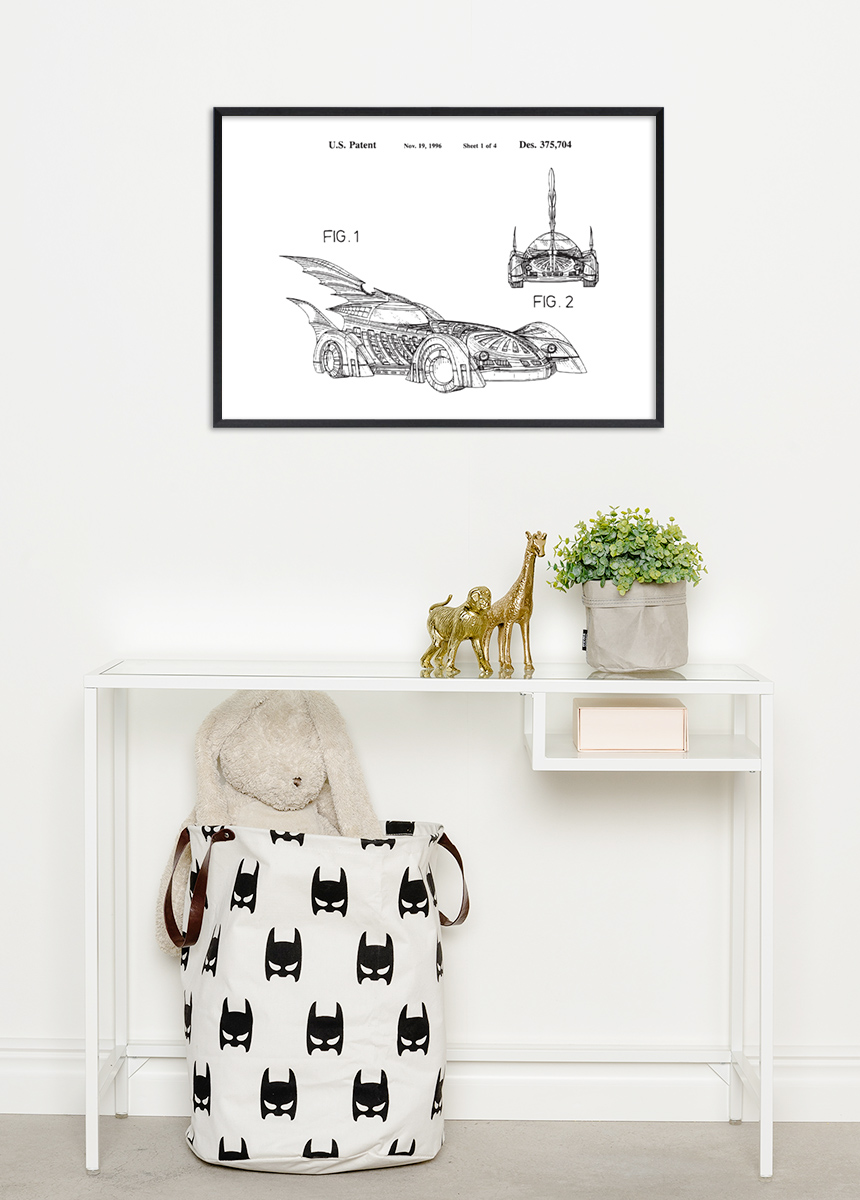 Denne stilrene patentplakaten er en hyllest til banebrytende design og er en del av det amerikanske patentet Des. 375,704, registrert den 19. november 1996. Illustrasjonene på denne patenttegningen – FIG. 1 og FIG. 2 – avbilder en spektakulær Batmobil som ikke bare viser teknisk innovasjon, men også enestående estetikk. Med sitt dynamiske formspråk og detaljrike utforming gir denne plakaten en følelse av bevegelse og framgang som fanger betrakterens oppmerksomhet.