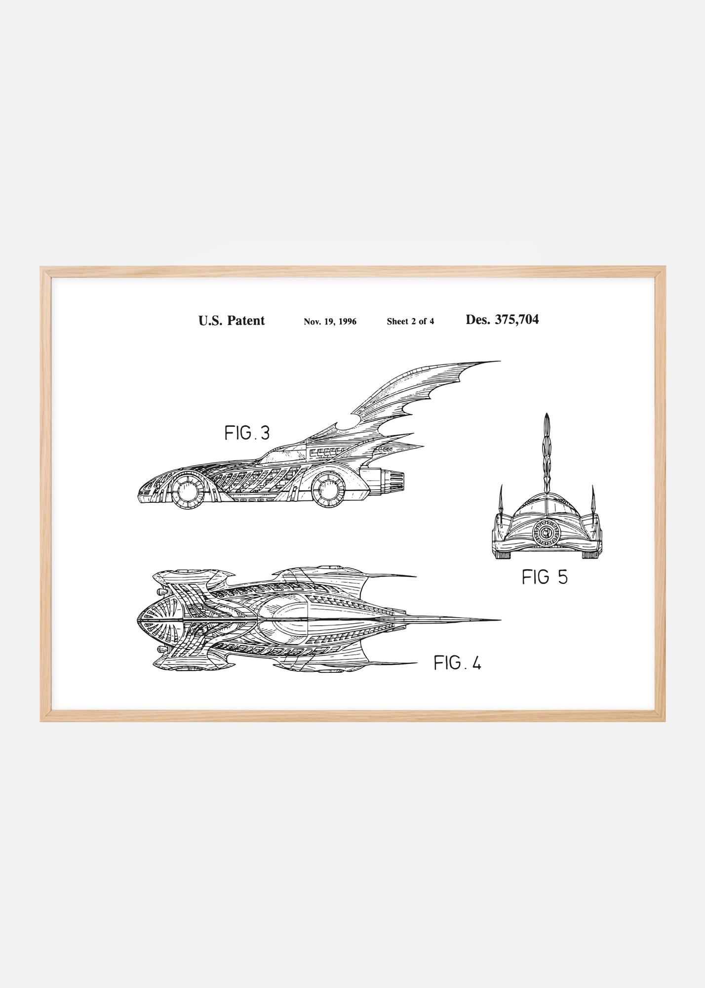 Denne unike patentposter viser storslåtte skisser fra det amerikanske patentet Des. 375,704, datert den 19. november 1996. Denne kunstneriske patentegningen gir en kreativ atmosfære til ethvert rom, med avbildninger av et konseptkjøretøy som er like mye et kunstverk som en teknisk forundring. FIG. 3 og FIG. 4 fremstiller en Batmobil i profil og oversikt, noe som gir betrakteren en følelse av dens innovative form og struktur, mens FIG. 5 fokuserer på den karakteristiske bakdelen og dens unike egenskaper.