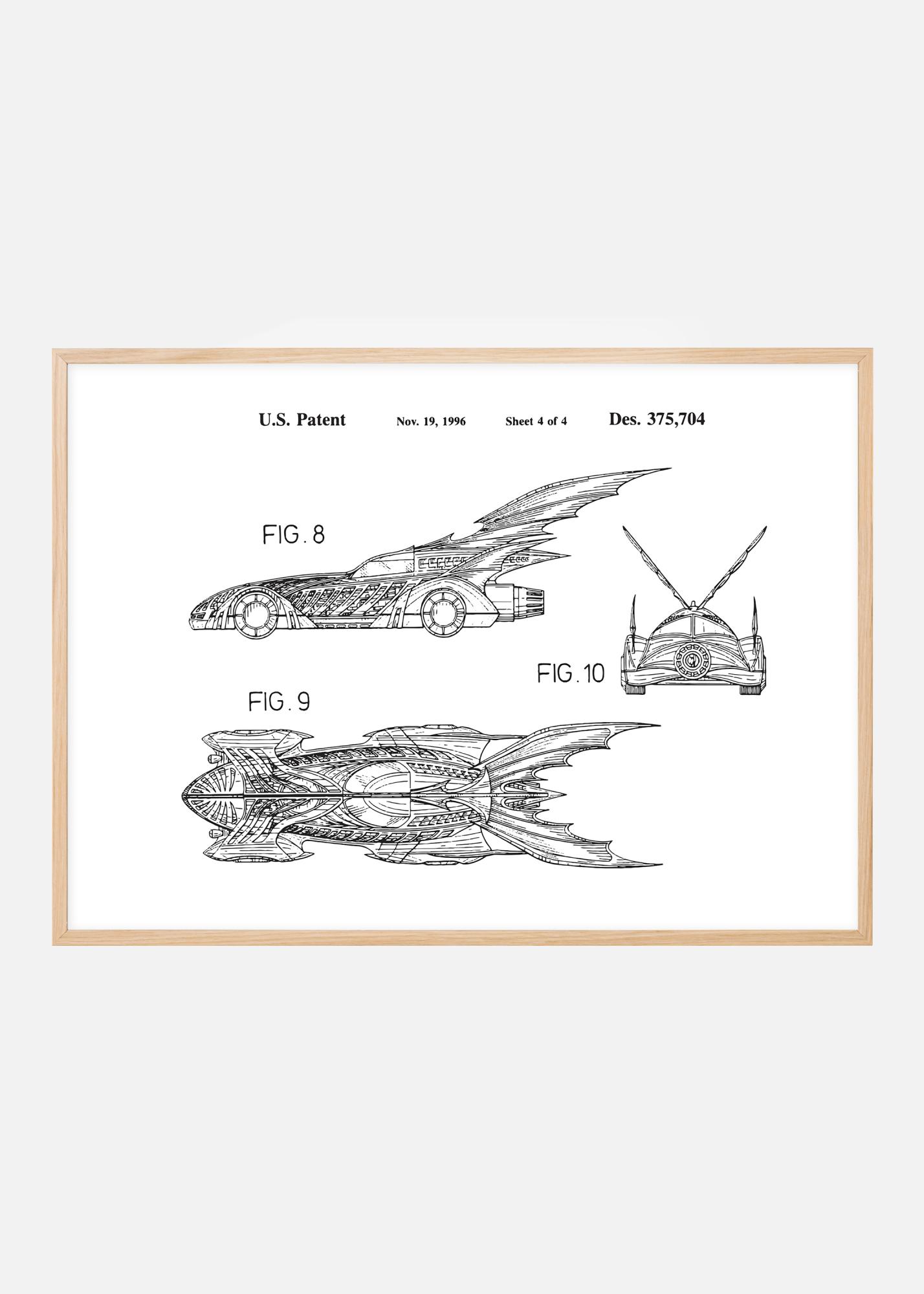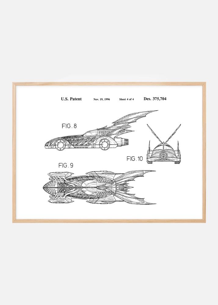 Denne patentposteren fanger essensen av futuristisk design og oppfinnsomhet. Den er en del av det amerikanske patentet Des. 375,704, utstedt den 19. november 1996. Med tre forskjellige visninger av Batmans bil, er denne patenttegningen et uttrykk for fremtidens visjoner som designeren så for seg. Hver figur avslører detaljerte og gjennomtenkte deler av kjøretøyets konstruksjon, fra de strømlinjeformede sidepanelene til de ikoniske vingene som strekker seg ut fra baksiden, noe som gjør det til en ikonisk interiørdetalj for alle som verdsetter design og innovasjon.