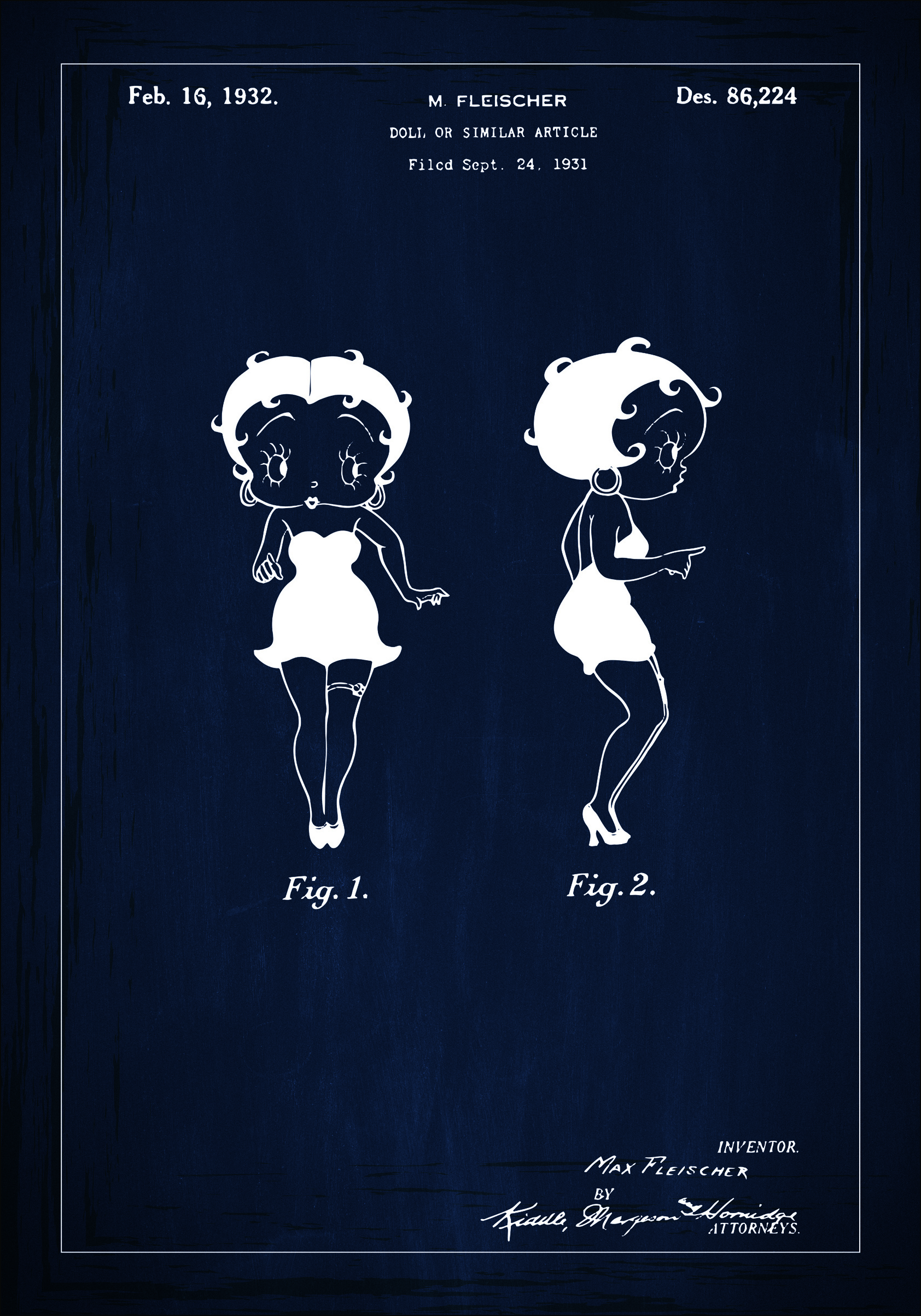 Denne patentposteren fra 16. februar 1932 viser en dukke av Betty Boop, designet av M. Fleischer. Patentnummeret er Des. 86,224, og søknaden ble innlevert 24. september 1931. På denne illustrasjonen ser vi to figurer av dukken; en forfra og en fra siden, som skildrer dukkens karakteristiske egenskaper og form.