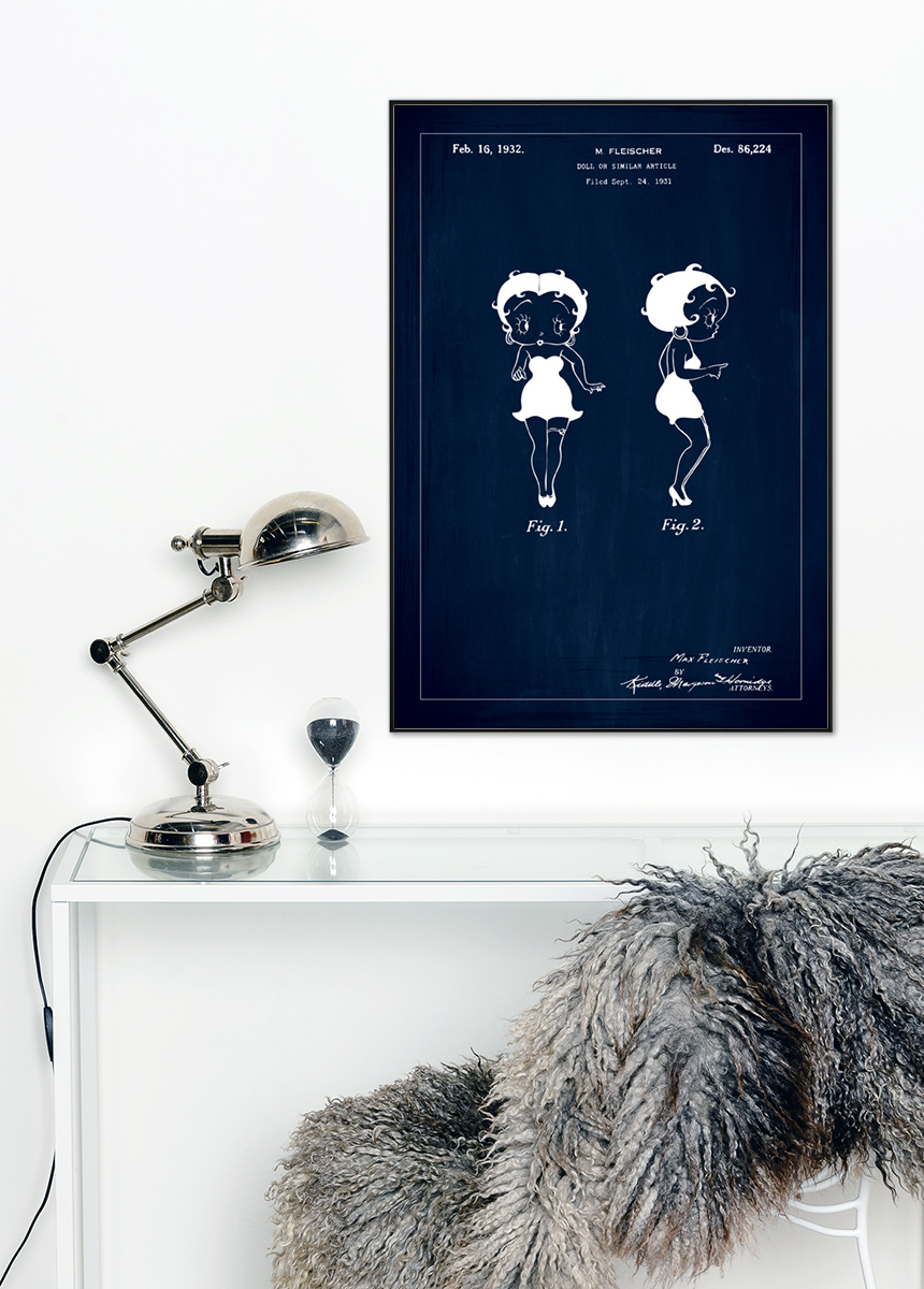 Får vi presentere en skikkelig fin patenttegning av ikoniske Betty Boop! Patentet som tegningen hører til ble utført 16.februar 1932 av the United States Patent Office. Plakaten har et motiv av Betty illustrert i 2 figurer. Nederst finner du skaperens navn sammen med en underskrift fra en advokat. Max Fleischer var en pioner innen amerikansk tegnefilm og han var en av de første som slo gjennom med animerte lydfilmer. Plakaten finnes i en rekke ulike størrelser så du finner enkelt en som passer like godt til skrivebordet som veggen.