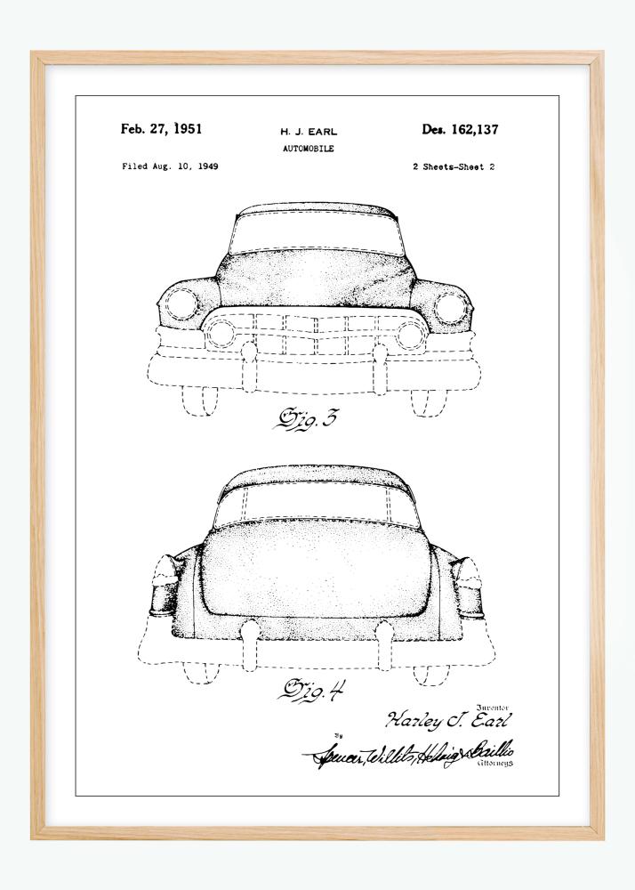 Imponer alle bilentusiastene du kjenner ved å henge opp denne eksklusive posteren på veggen! Posteren er en kopi av en av patenttegningene som Harley Earl gjorde for Cadillac. Motivet forestiller den berømte bilen vist for- og bakfra med en dekorativ linje rundt. Øverst kan du se at tegningen ble levert inn den 10. august 1949, at patentet ble utstedt 27. februar 1951 samt hvilket patentnummer det fikk. Nederst finner du Harley Earls signatur sammen med en underskrift fra en advokat. Dette er side 2 av totalt 2 sider som hører med til patenttegningen. Selvsagt finner du også side 1 i vårt sortiment. Posteren finnes i flere ulike størrelser slik at du lett kan velge en som passer i nettopp ditt hjem. Kompletter gjerne med en ramme fra vårt store sortiment!