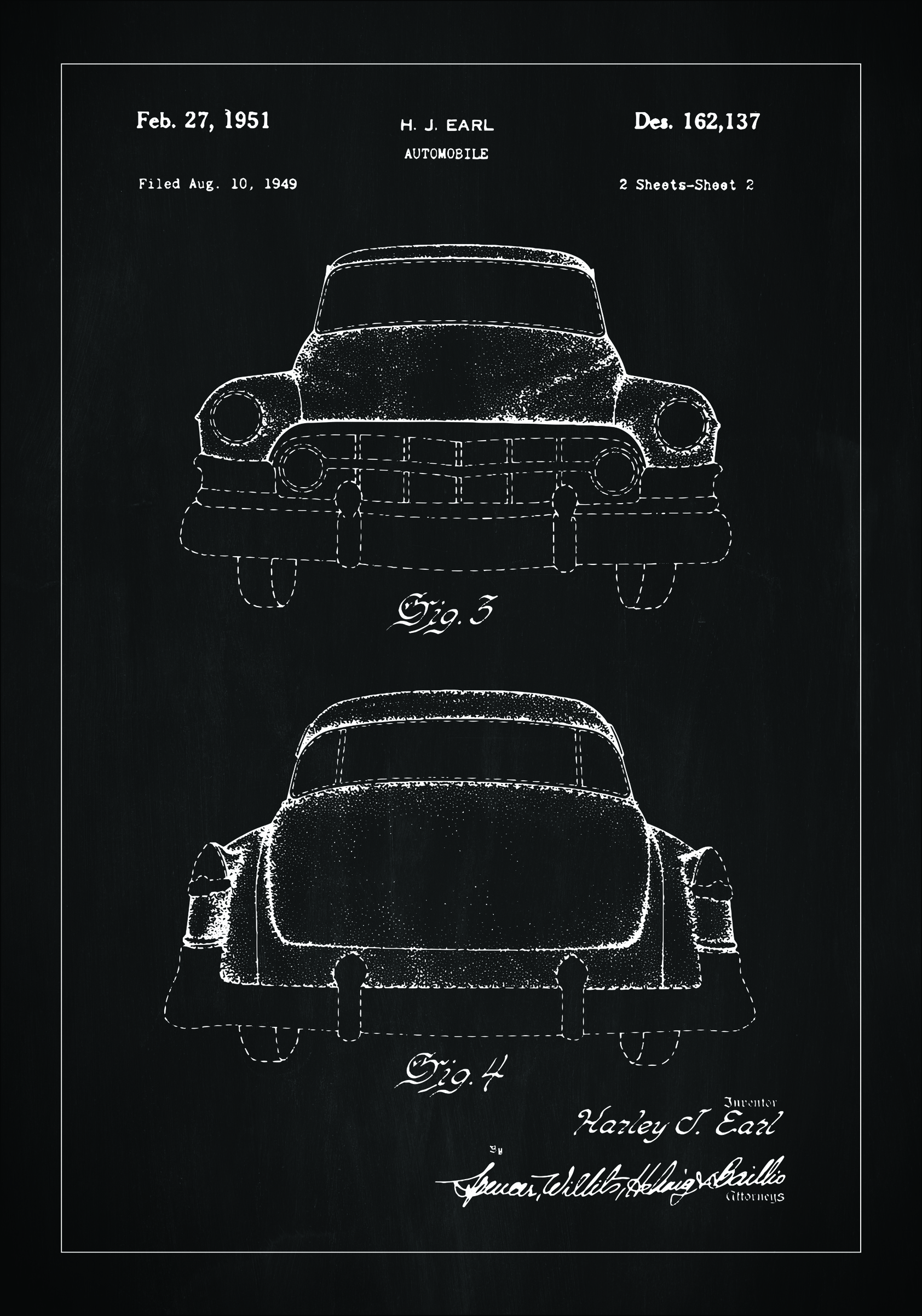 Denne patentplakaten viser en klassisk bilmodell av Cadillac, patentert den 27. februar 1951 under patentnummer Des. 162,137. Oppfinneren, H.J. Earl, leverte inn patentet den 10. august 1949. De illustrerte visningene viser kjøretøyets frem- og bakside, og gir et tydelig bilde av det tidløse designet og de estetiske linjene som var signifikante for den epoken av bilkonstruksjon.