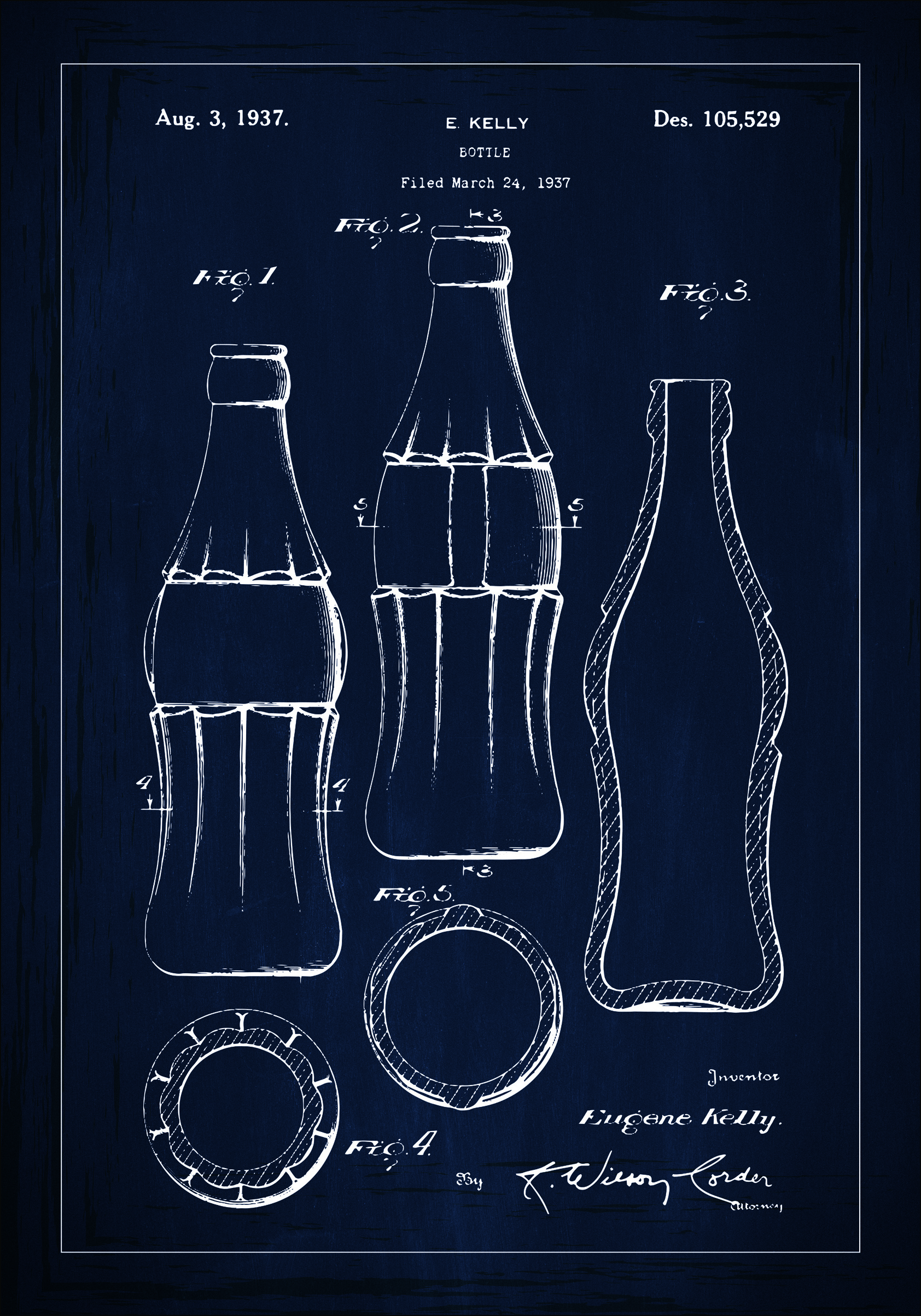Denne patentposteren illustrerer et designpatent for en CocaCola-flaske, som ble gitt 3. august 1937 under patentnummer Des. 105,529. Oppfinneren, Eugene Kelly, stod bak dette klassiske designpatentet som ble innlevert 24. mars 1937. Tegningene viser flaskens form fra ulike perspektiver, inkludert en front, en gruppert sammenstilling, en profilvisning samt to tverrsnittvisninger. Detaljene og proporsjonene fremhever den distinkte og gjenkjennelige konturen som har blitt ikonisk over hele verden.