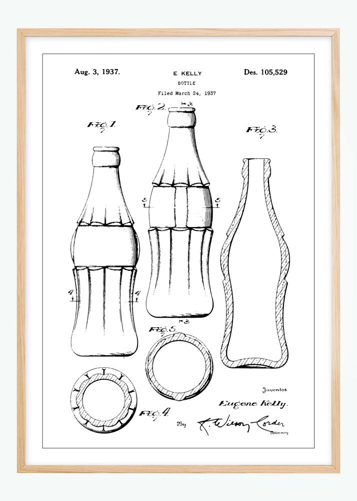Pynt veggen din med en flott patenttegning av den berømte Coca Cola-flasken! Denne posteren blir garantert et fint innslag i interiøret ditt, særlig hvis du har diverse retro-saker å matche med. Tegningen forestiller flasken i flere ulike vinkler og utførelser. Øverst kan du se at den ble innlevert den 24. mars 1937, at patentet ble godkjent den 3. august samme år samt hvilket patentnummer den ble tildelt. Nederst finner du formgiveren Eugene Kellys navn og en underskrift av en advokat. Rundt motivet går det en tynn, svart linje. Siden plansjen finnes i flere ulike utførelser, finner du enkelt en som passer i nettopp ditt hjem. Kompletter gjerne med en ramme fra vårt store sortiment!