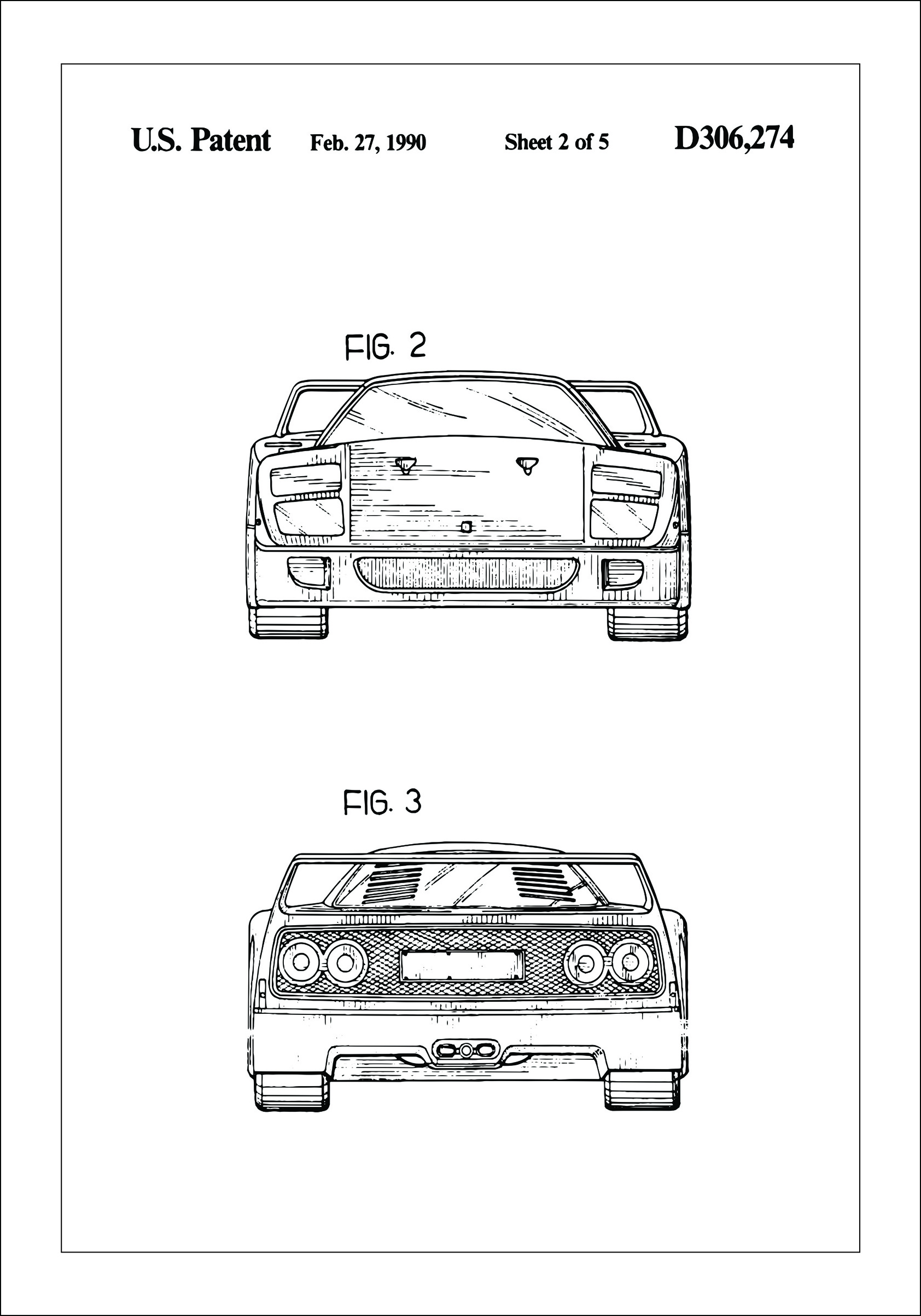 Denne patentposteren avbilder den bakre designen av en Ferrari F40, som ble tildelt patent den 27. februar 1990 under nummer D306,274. Tegningene viser bilens forside og bakside med dens distinkte lysarrangement, støtfanger og formgivning. Detaljene i illustrasjonene fremhever de unike designelementene som skiller denne bilmodellen ut og bidrar til dens gjenkjennelse på veiene.