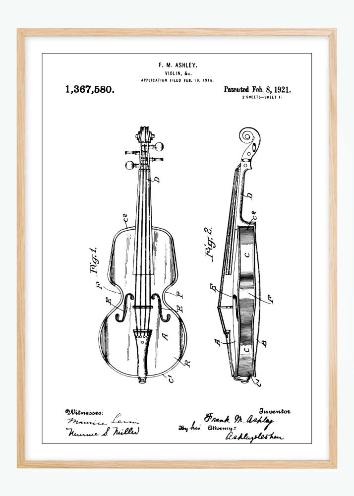 Denne elegant utformede patentposteren presenterer en klassisk oppfinnelse, en fiolin, fra det amerikanske patentet 1,367,580. Patentet ble gitt den 8. februar 1921 til oppfinneren F. M. Ashley, hvis signatur gir en personlig touch til dette historiske dokumentet. Med sitt tradisjonelle og tidløse utseende er denne patenttegningen en hyllest til musikkens og håndverkets verden.