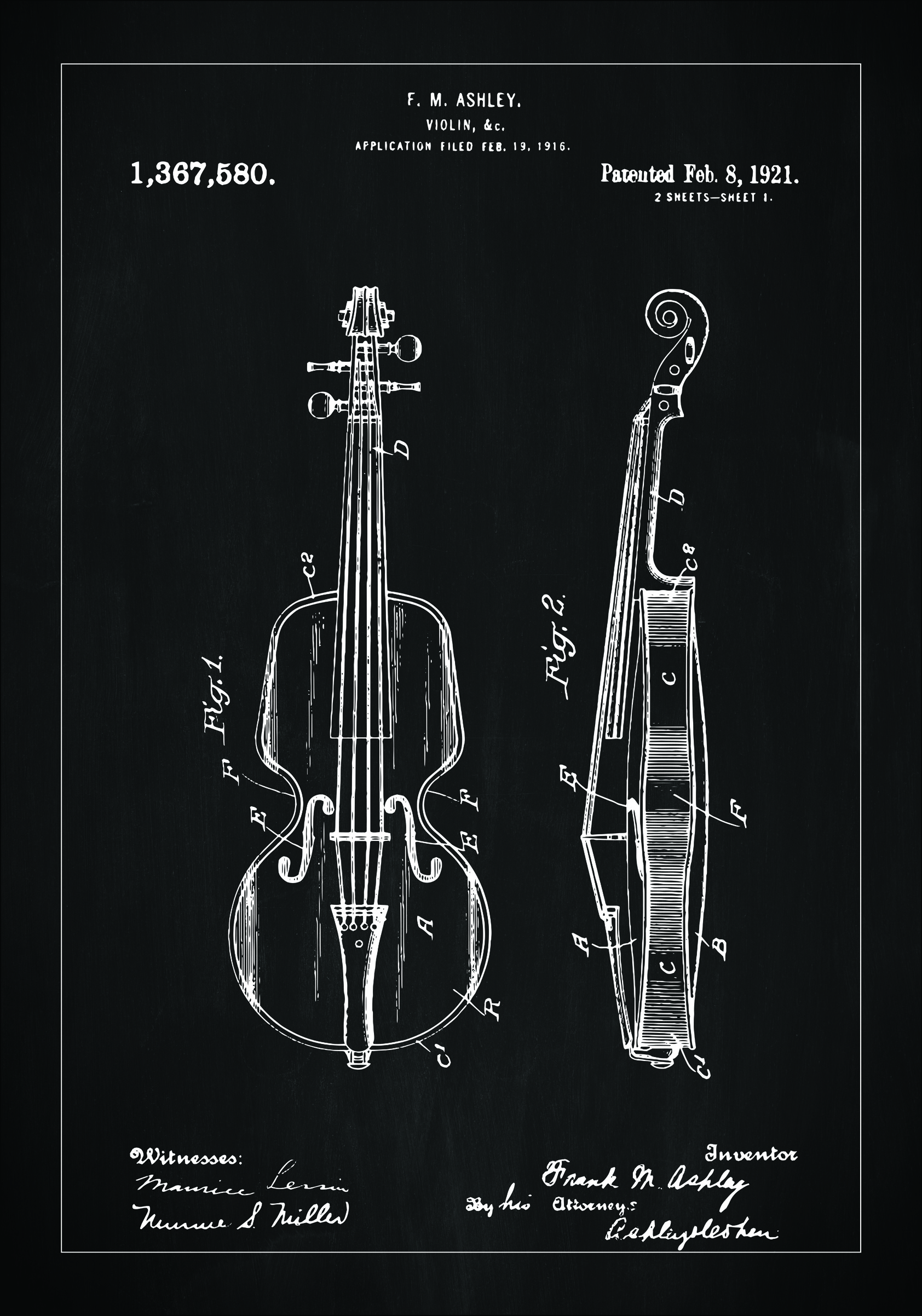 Denne eksklusive patentposteren presenterer de detaljerte illustrasjonene fra patentet med nummer 1,367,580, utstedt den 8. februar 1921 til F. M. Ashley for en fiolin. Den nøye utformede tegningen skildrer instrumentets eleganse og kompleksitet, fra den velformede kroppen til de fine detaljene i strengefestet og stolen. Svart-hvitt kontrasten mot den sorte bakgrunnen gir en dramatisk og moderne følelse, som fremhever hver linje og kurve på dette klassiske musikkinstrumentet.