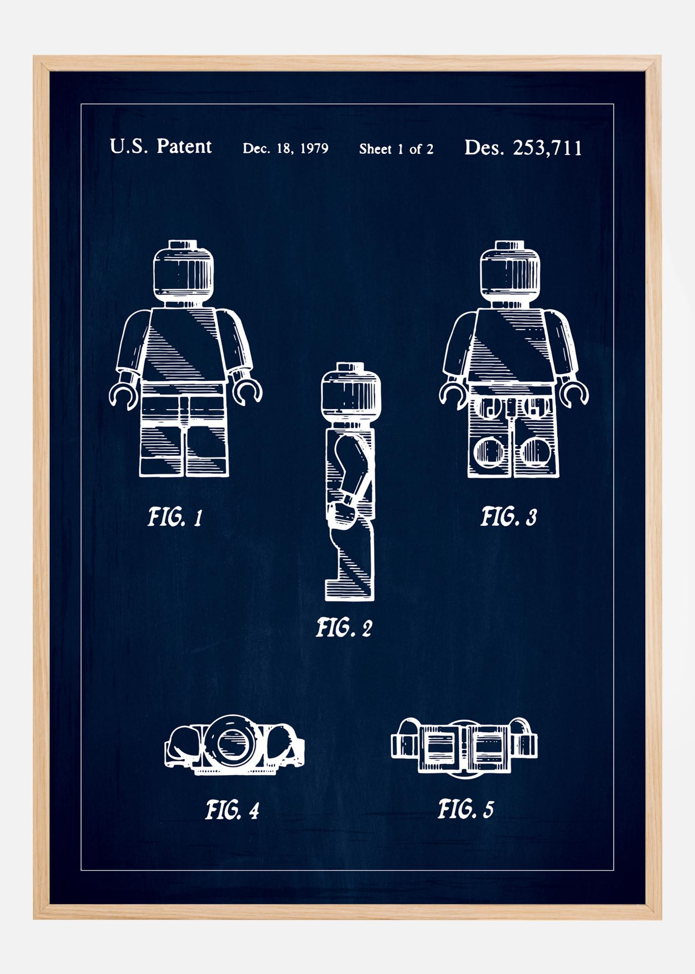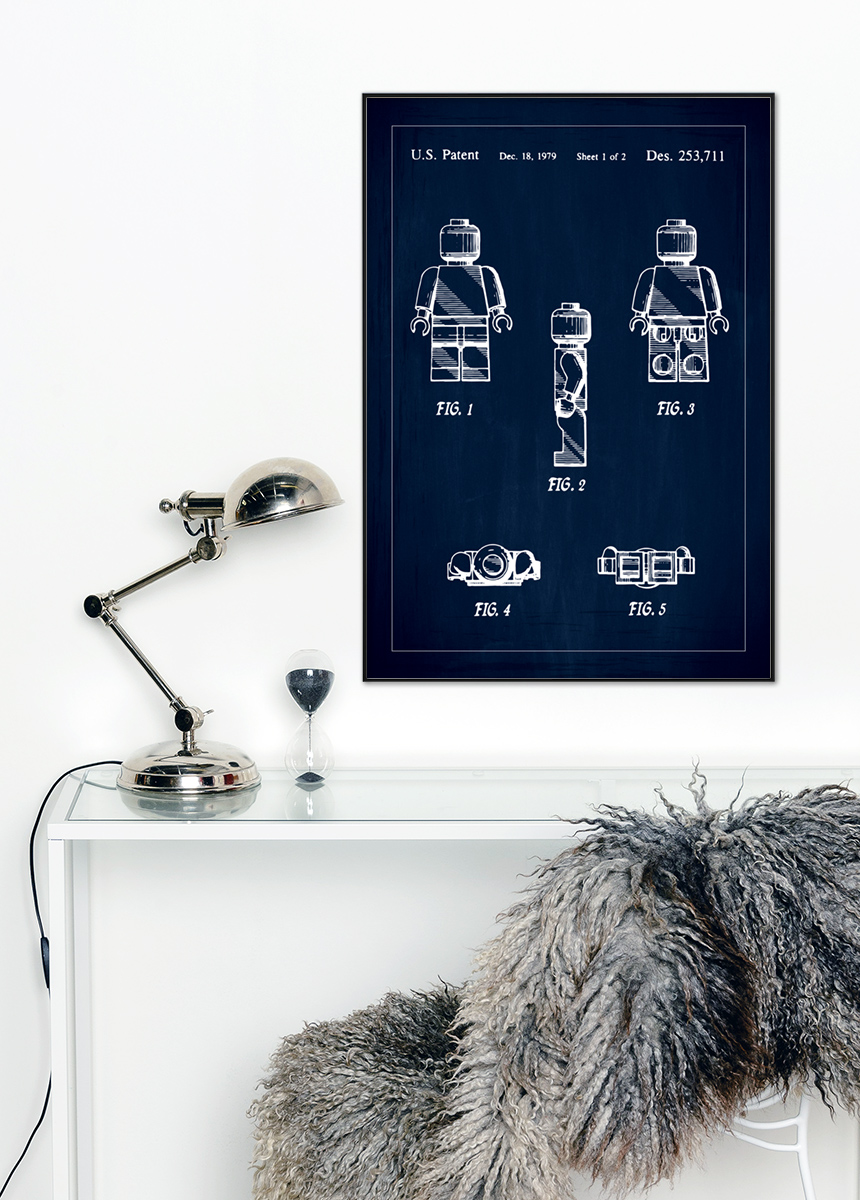 Denne unike patentplakaten viser en klassisk leketøysfigur fra Lego som fanger en spesiell plass i både barns og voksnes hjerter. Det detaljerte motivet er en autentisk kopi av den opprinnelige patenttegningen, arkivert den 18. desember 1979, med patentnummer Des. 253,711. Kunstnerisk presentert mot en mørk bakgrunn, forvandles den tekniske illustrasjonen til et stilrent kunstverk som hedrer innovasjon og design. Perfekt for den interiørinteresserte eller samleren, denne patentplakaten er en hyllest til tidløs kreativitet og lekenhet.