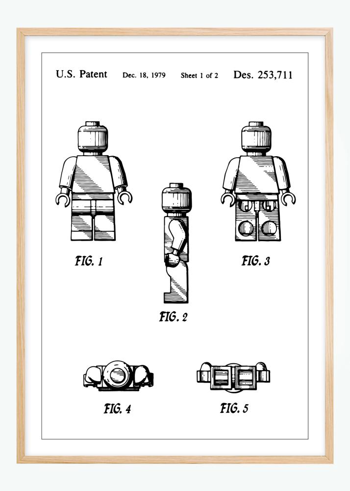 Denne patentposteren presenterer en klassisk byggbar Lego-figur, som er en tidløs og kreativ leke som har fengslet barns fantasi i generasjoner. Bevilget den 18. desember 1979, under patentnummer Des. 253,711, avbilder tegningen en byggbar figur i flere visninger, som demonstrerer lekens modulære design og fleksibilitet. Det er en enkel, men samtidig genial representasjon av konseptet med interaktiv og pedagogisk lek.