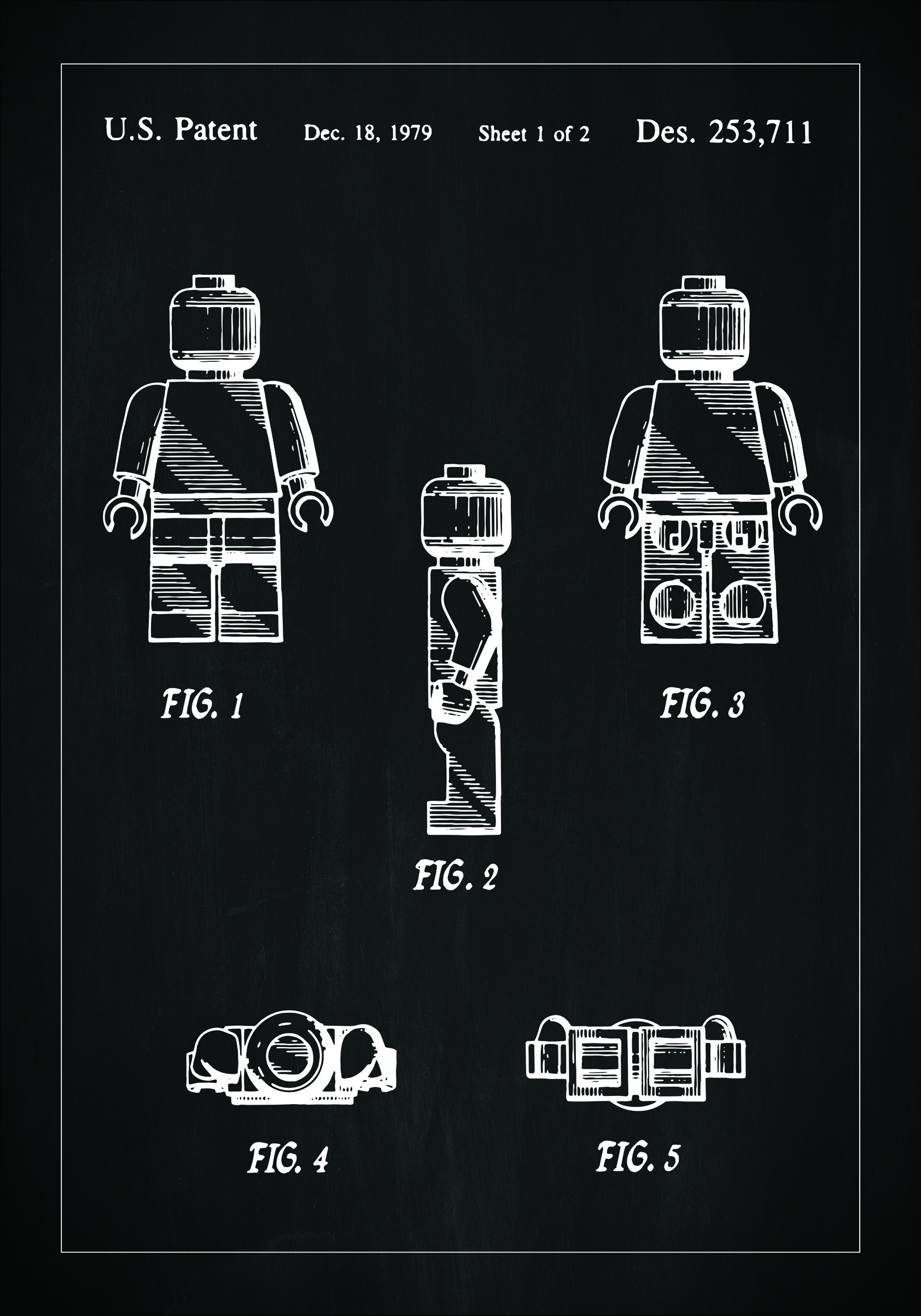 Denne patentplakaten avbilder oppfinnsomheten i leketøydesign, representert gjennom patent Des. 253,711 datert den 18. desember 1979. Patentskissen viser en delt konstruksjon av en leketøysfigur fra Lego, presentert i flere visninger: forfra, sidevisning og detaljvisninger av hodet og kroppen. De fem figurene er nummererte og demonstrerer leketøyets evne til å bli tatt fra hverandre og satt sammen, en funksjon som har inspirert en hel generasjon av leketøydesign.