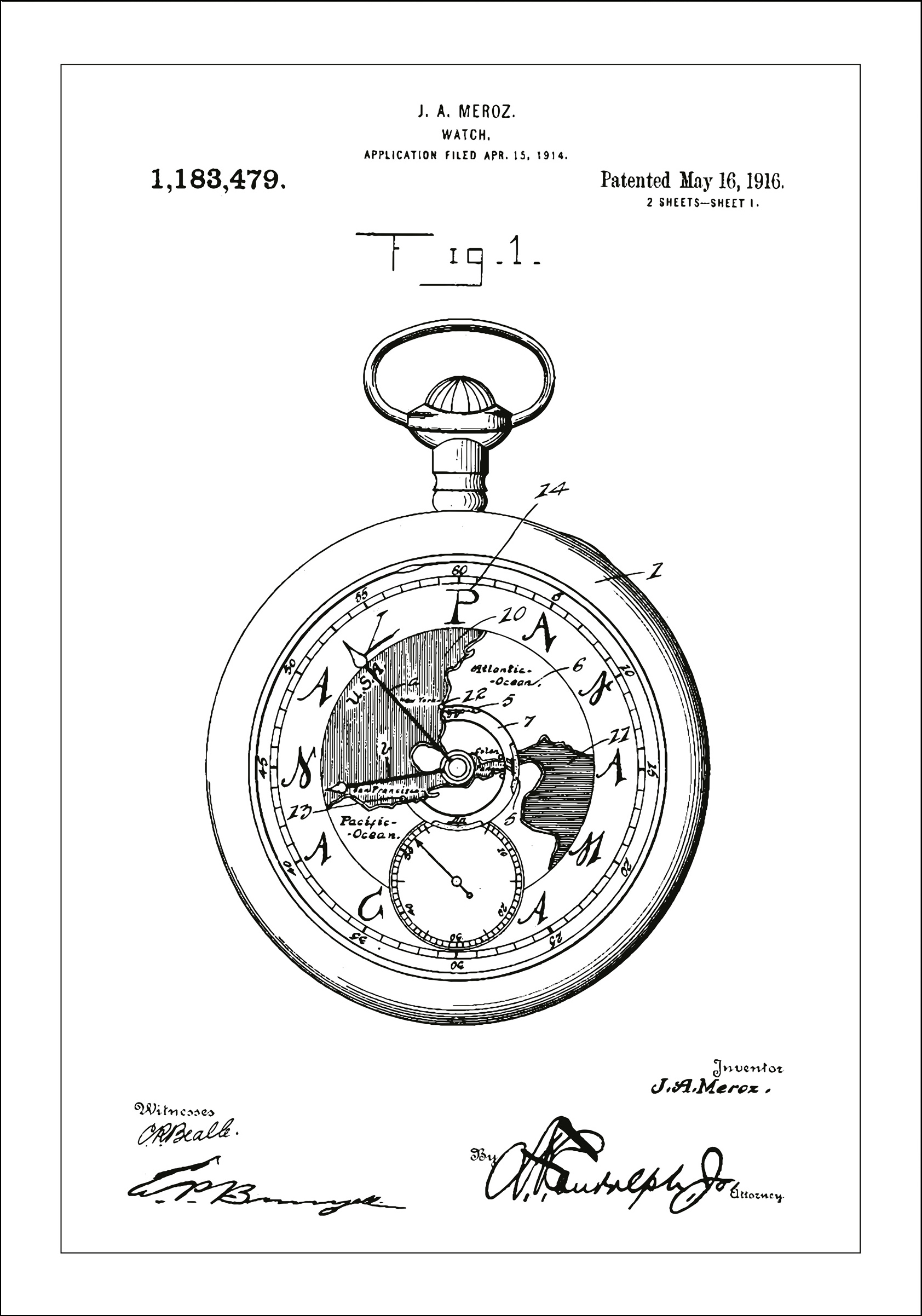 Dette er en fascinerende patentposter som viser en detaljrik skisse av J.A. Meroz' klokkedesign, patentert den 16. mai 1916 under nummer 1,183,479. Patenttegningen detaljerer en klassisk lommeursilhuett med de distinkte elementene av tidtakerens indre mekanikk, som fremhever en æra av teknisk innovasjon og håndverksdyktighet innen urmakerkunsten.
