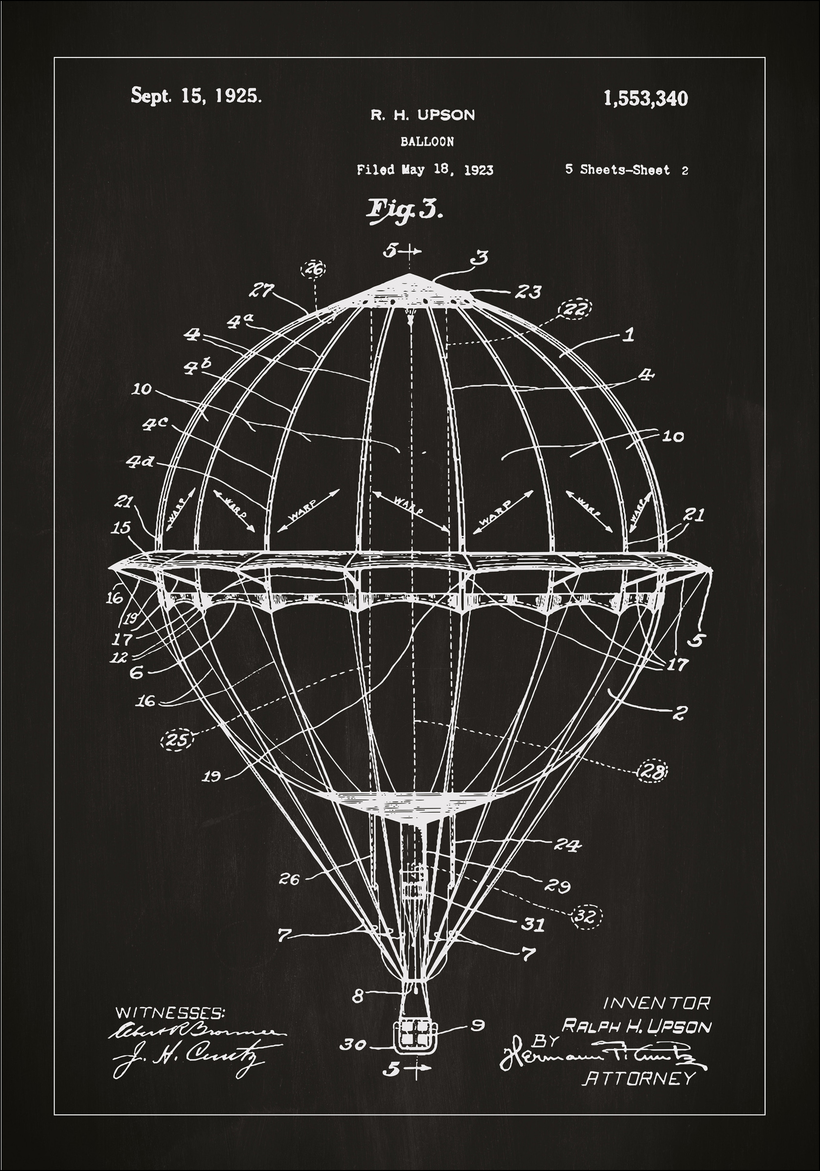 Denne unike fremstilte patentplakaten illustrerer en detaljert konstruksjon av en luftballong, hvis originalpatent ble skapt av innovatøren Ralph H. Upson. Patentert den 15. september 1925 under nummer 1,553,340, er dette et fascinerende eksempel på tidlig aerodynamisk ingeniørkunst. Denne patentplakaten er en hyllest til drømmen om å sveve blant skyene og menneskehetens streben etter å utforske himmelen.