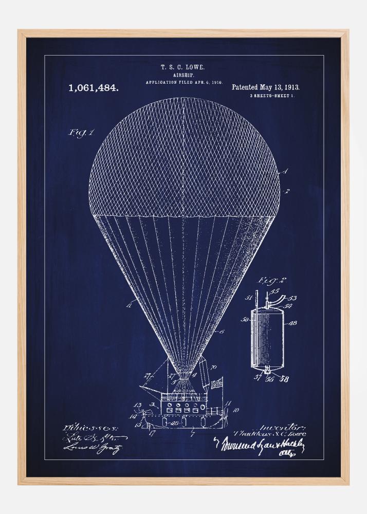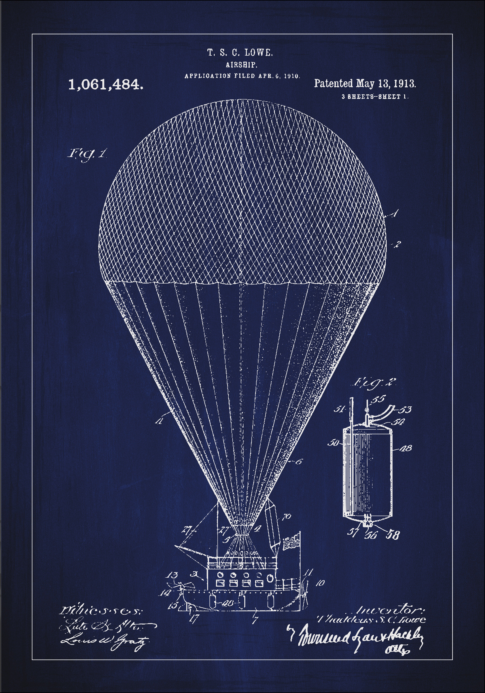 Med stolthet presenterer vi denne patentplakaten som skildrer T. S. Lowes luftskip, en oppfinnelse som markerte et fremskritt i tidlig luftfart. Patentet, med nummer 1,061,484, ble innvilget den 13. mai 1913 og bærer med seg en tid av eventyr og innovasjon. Denne plakaten er en hyllest til det tidlige 1900-tallets kreative ånd og tekniske drømmer.