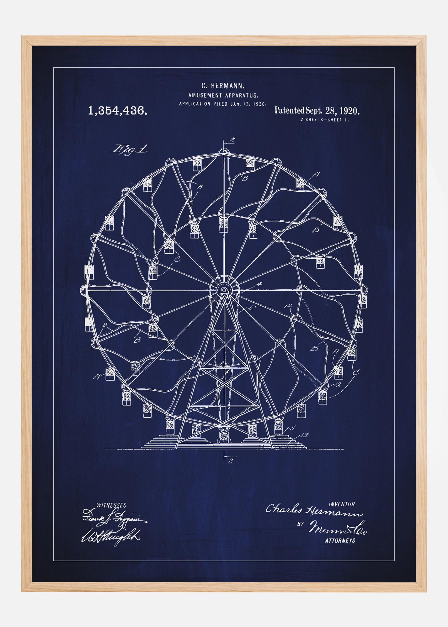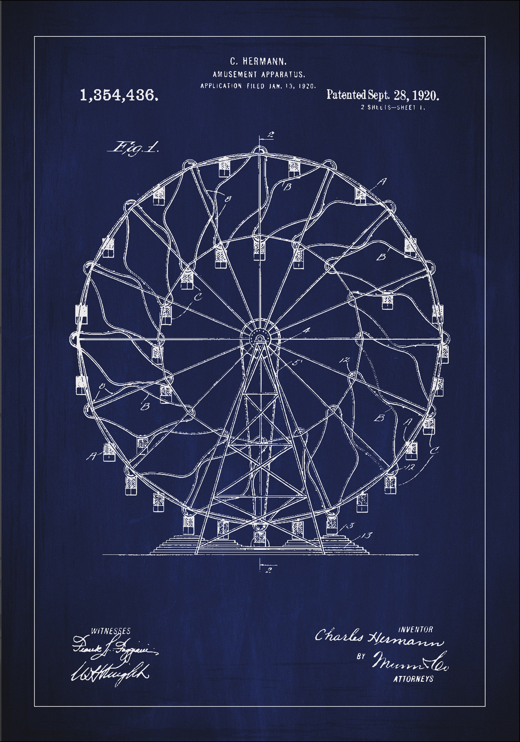 Forvandle hvilken som helst vegg til en hyllest til klassisk ingeniørkunst med denne patentposteren av C. Hermanns design for en underholdningsattraksjon, spesifisert i patentnummer 1,354,436 som ble gitt den 28. september 1920. Denne dyktig skapede illustrasjonen av et pariserhjul er ikke bare et dekorativt kunstverk, men også en representasjon av en tid da underholdning ble tekniske bragder. Detaljene i konstruksjonen fanger en svunnen æra av fornøyelsesparkenes gullalder og den mekaniske kunstens mesterverk.