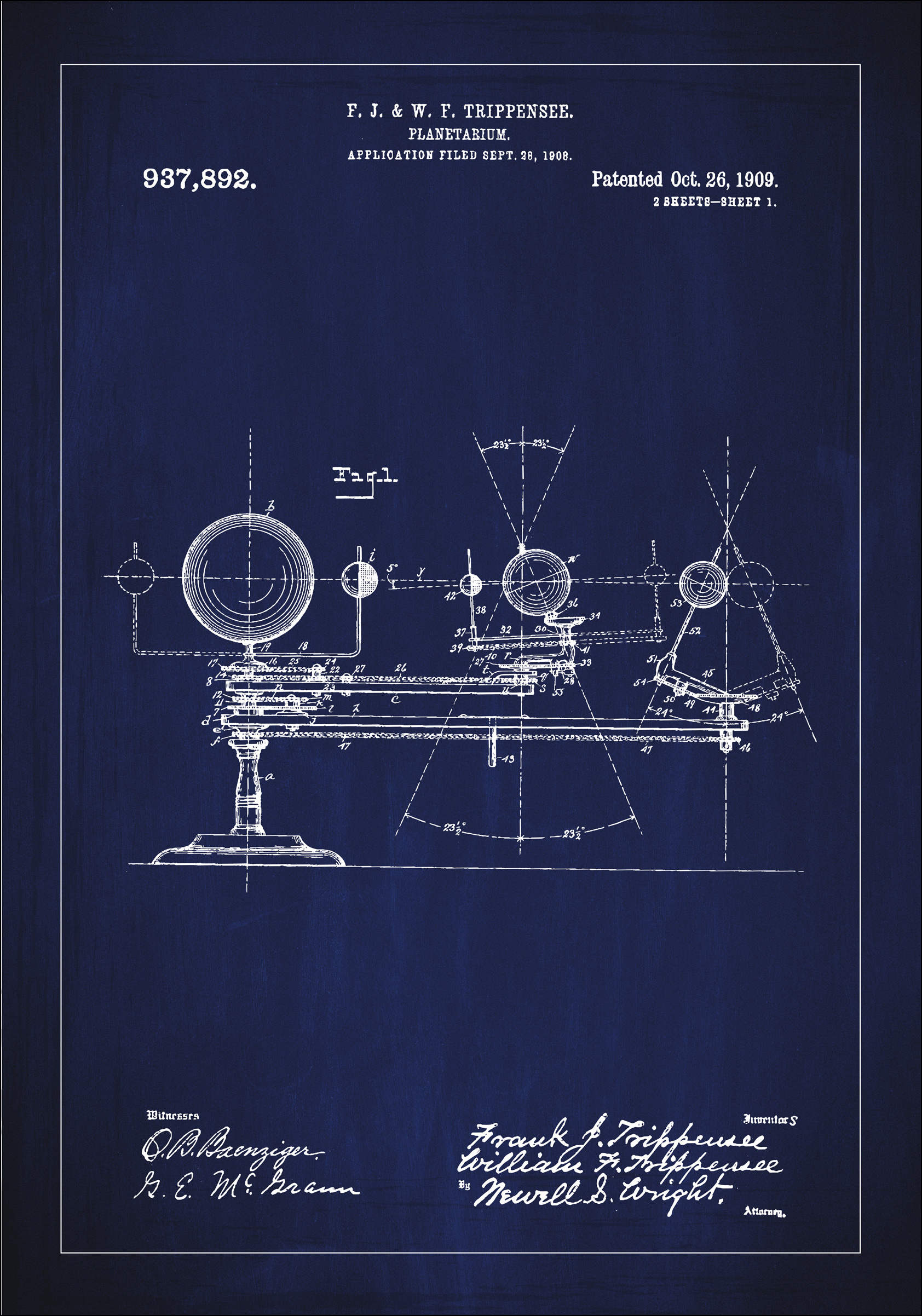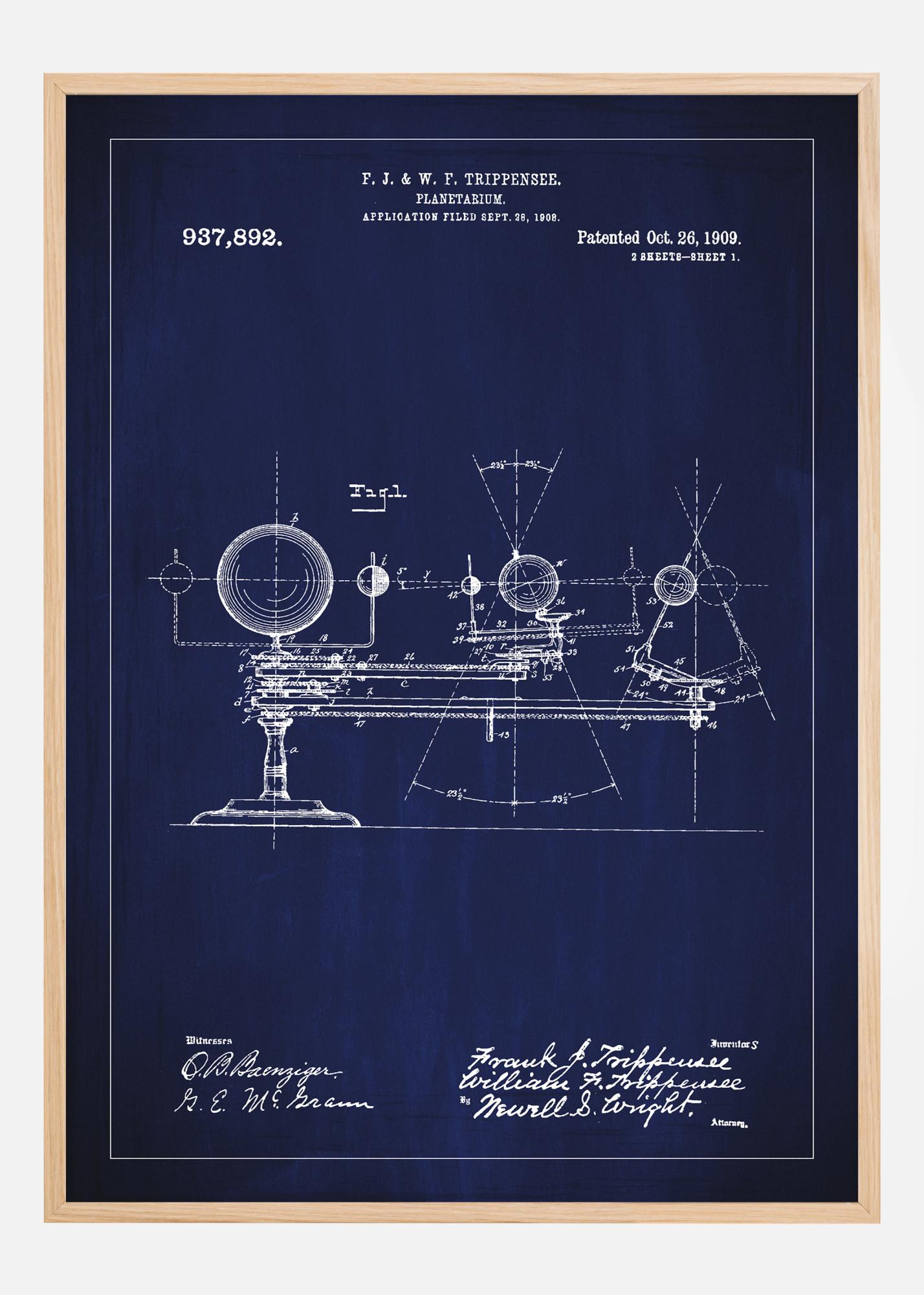 Denne staselige patentplakaten fremstiller patenttegningen av et planetarium, gitt til F. J. & W. F. Trippensee under patentnummer 937,892. Patentet, som offisielt ble registrert den 26. oktober 1909, er et mesterverk av teknisk tegning og design som legemliggjør tidens vitenskapelige bestrebelser og oppfinnsomhet. Motivene gir et innblikk i den tidlige astronomiens instrumenter, og det er en eksklusiv dekor for alle som har interesse for vitenskapens historie eller som verdsetter antikke vitenskapelige instrumenter.