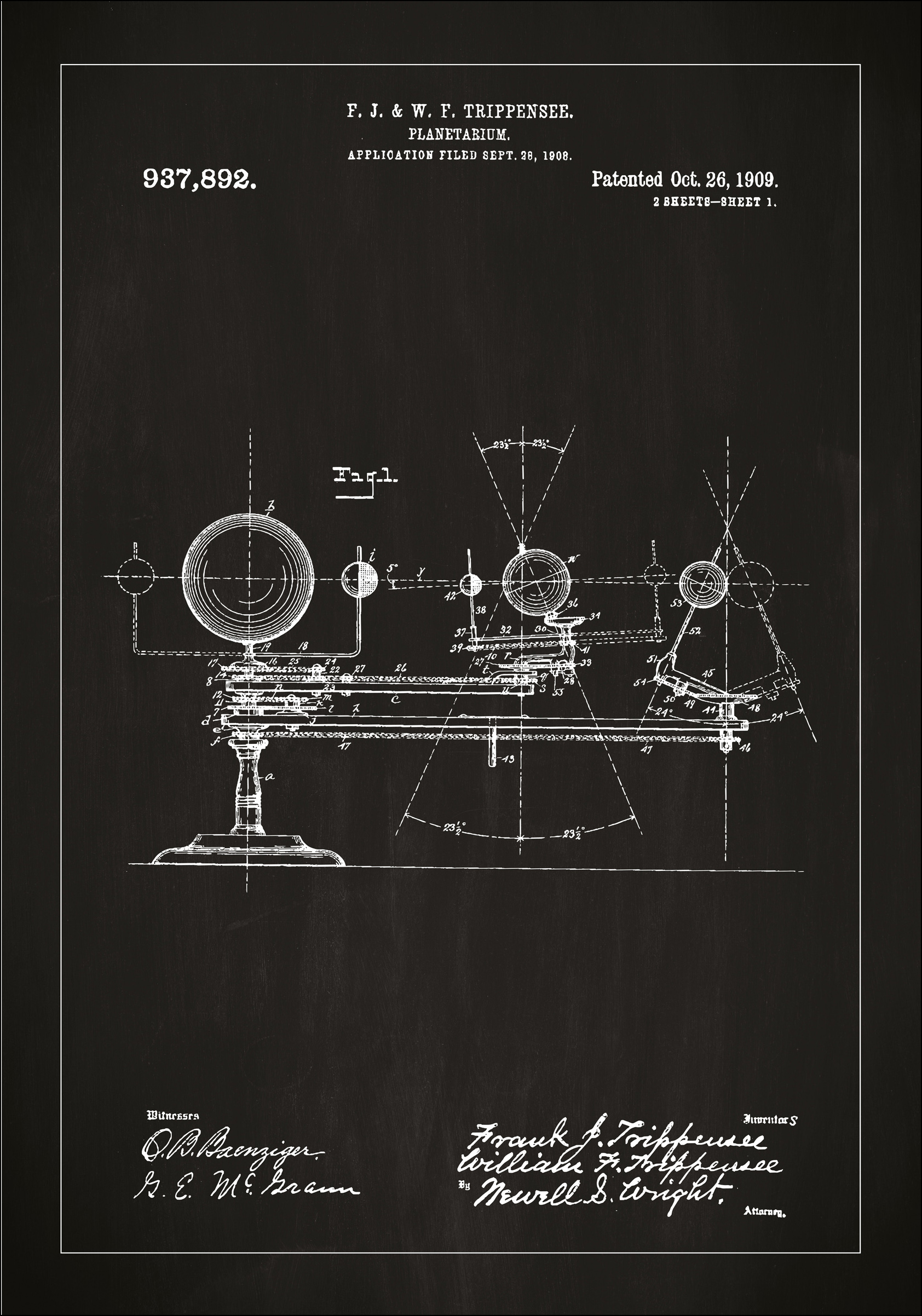 Denne nøye utformede patentplakaten presenterer et planetarium, et instrument som banet vei for studiet av himmellegemenes bevegelser. Patenttegningen viser F. J. & W. F. Trippensees design, som ble tildelt patentnummer 937,892 den 26. oktober 1909, etter søknad den 28. september 1908. Hver detalj og komponent i konstruksjonen er vakkert gjengitt, noe som avslører kompleksiteten og presisjonen til dette undervisningsverktøyet for astronomi. Det er et fengslende og inspirerende bilde for alle med en lidenskap for stjernehimmelen og de pedagogiske verktøyene som har blitt brukt for å utforske den.