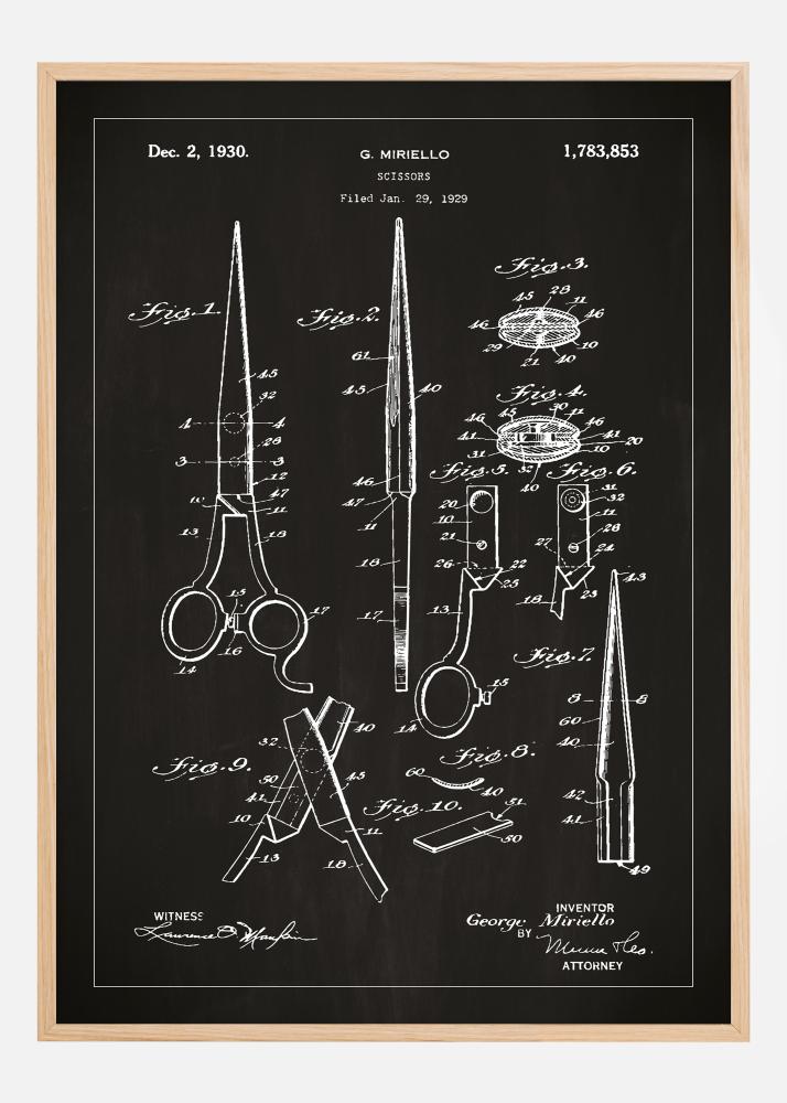 Denne distinkte patentplakaten er en hyllest til et klassisk designikon – saksen. Den avbilder G. Mirellos patent, som ble utstedt den 2. desember 1930 med patentnummer 1,783,853, etter å ha blitt innlevert den 29. januar 1929. Med nøyaktige skisser som viser forskjellige vinkler og deler av saksen, fra de spisse bladene til de ergonomisk utformede håndtakene, fanger denne patenttegningen selve essensen av håndverk og design.