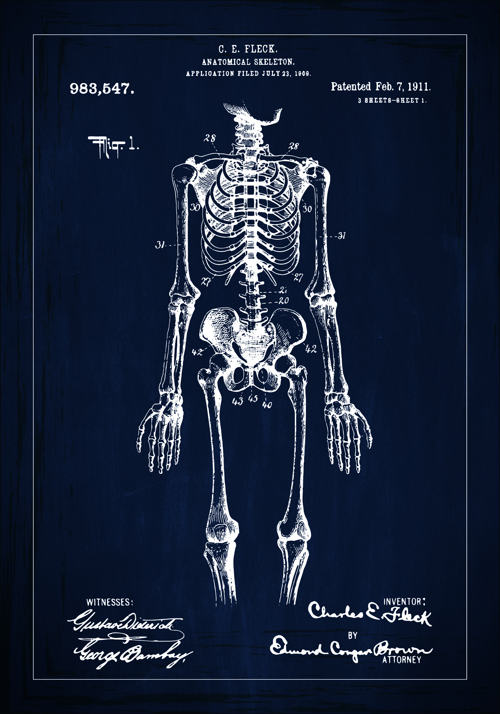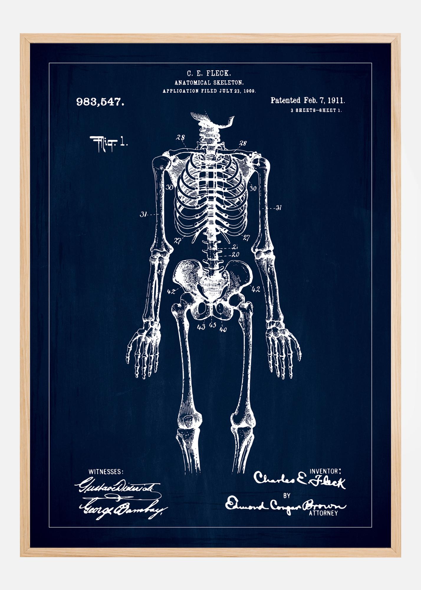 Denne imponerende patentposteren viser patent nummer 983,547, innvilget den 7. februar 1911, og representerer en anatomisk skjelettmodell, skapt av C. E. Fleck. De skarpe hvite konturene mot den mørke bakgrunnen avbilder den menneskelige anatomi med en kombinasjon av presisjon og kunstnerisk estetikk, som markerer hvert bein og viktig struktur i skjelettet.