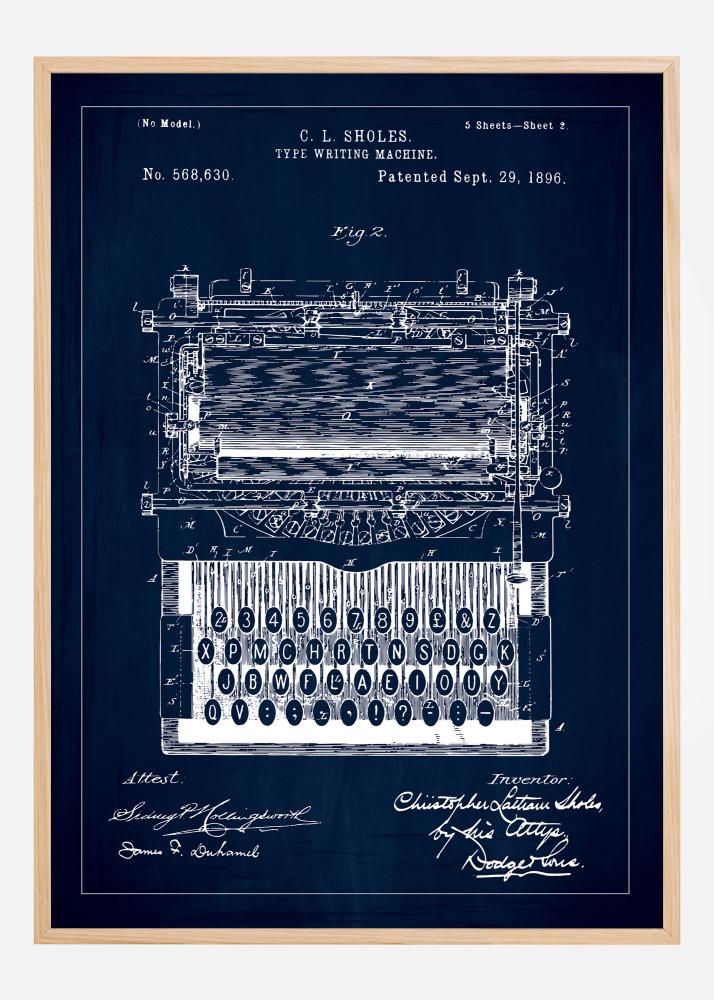 Beundre denne distinkte patentplakaten som fremstiller den historiske oppfinnelsen av skrivemaskinen, patent nummer 568,630, gitt til C. L. Sholes den 29. september 1896. Denne patenttegningen er ikke bare en visuell representasjon av en tidlig maskinskrivningsenhet, men også et stykke av kommunikasjonshistorien, presentert her i strålende hvite linjer på en marineblå bakgrunn, som skaper en sterk og attraktiv kontrast.