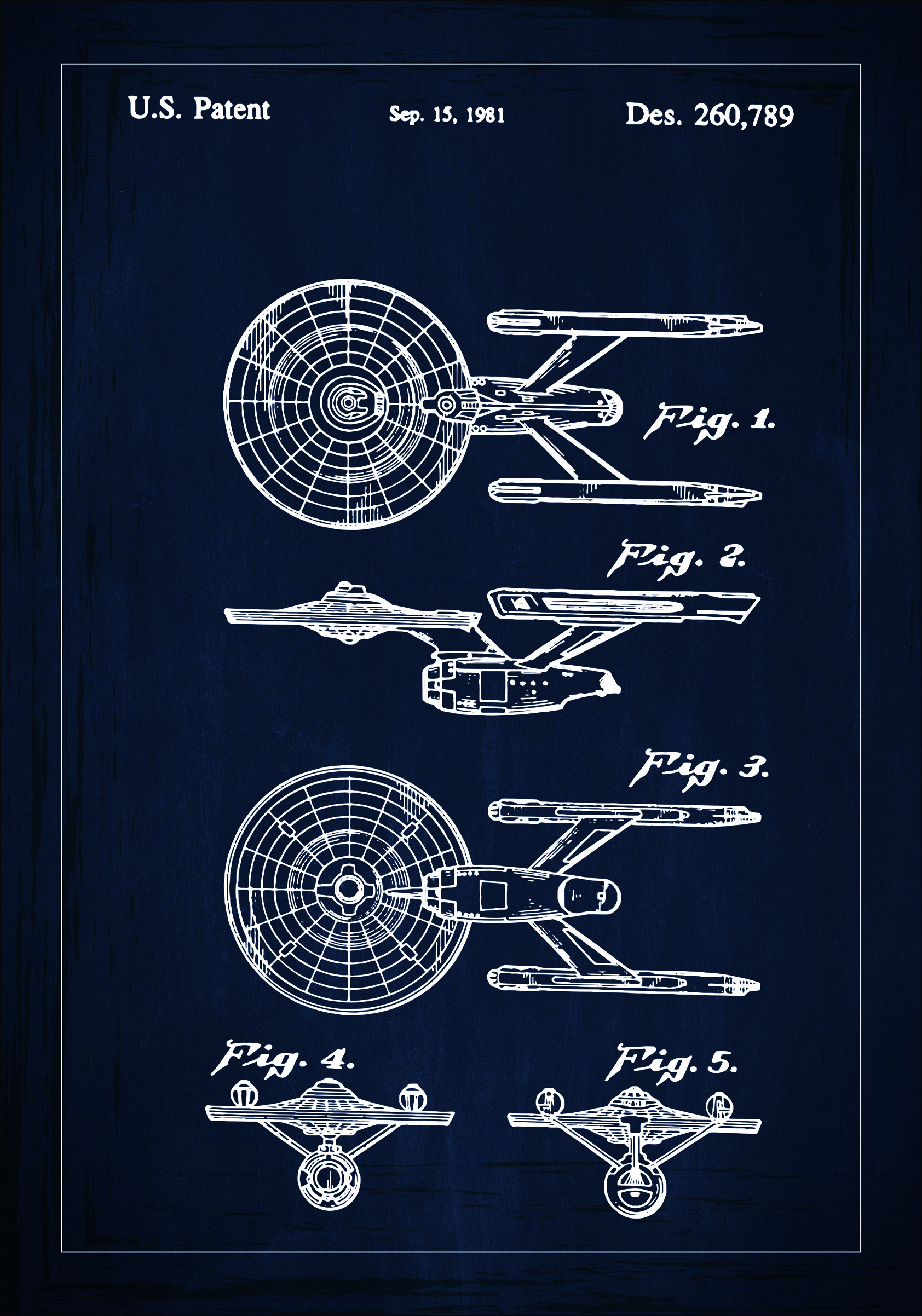 Denne patentplakaten gjengir designen av romskipet Enterprise fra Star Trek, med patentnummer Des. 260,789 datert 15. september 1981. Den detaljerte patenttegningen er et eksempel på tidlig sci-fi-inspirert innovasjon, en visjon om fremtidig utforskning av kosmos. Illustrasjonene viser fartøyet fra forskjellige vinkler og posisjoner, noe som gir en dyp forståelse for dets unike og komplekse struktur. Patentplakaten er et uttrykk for menneskehetens streben etter å nå stjernene og en perfekt dekorasjon for alle som drømmer om interstellære eventyr.