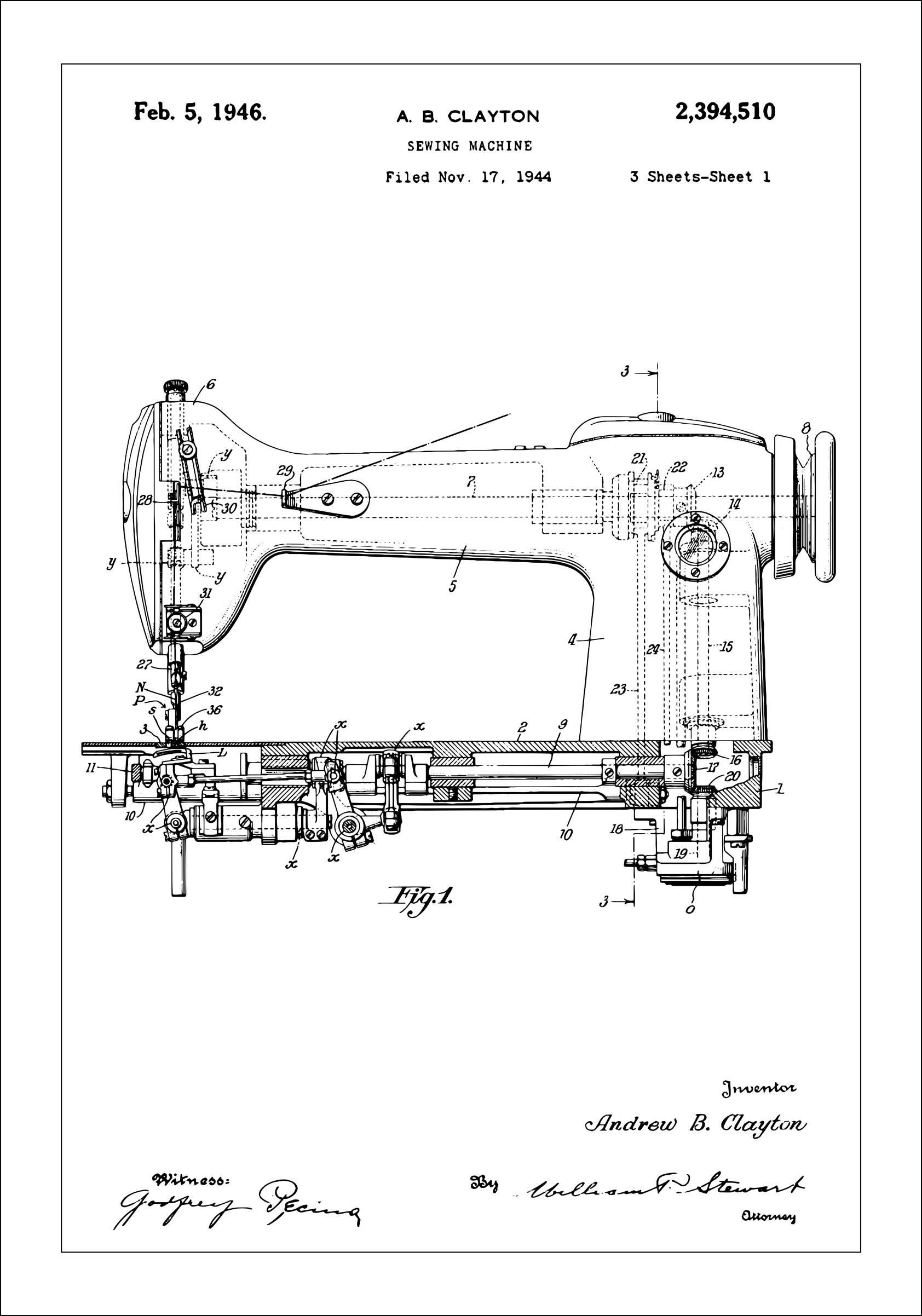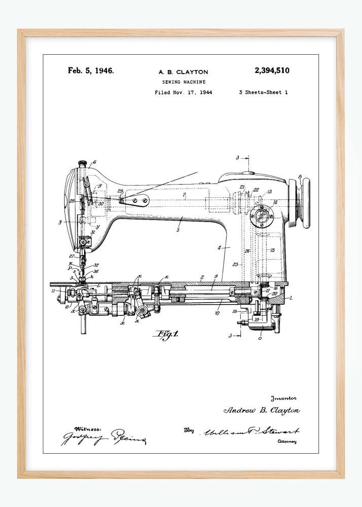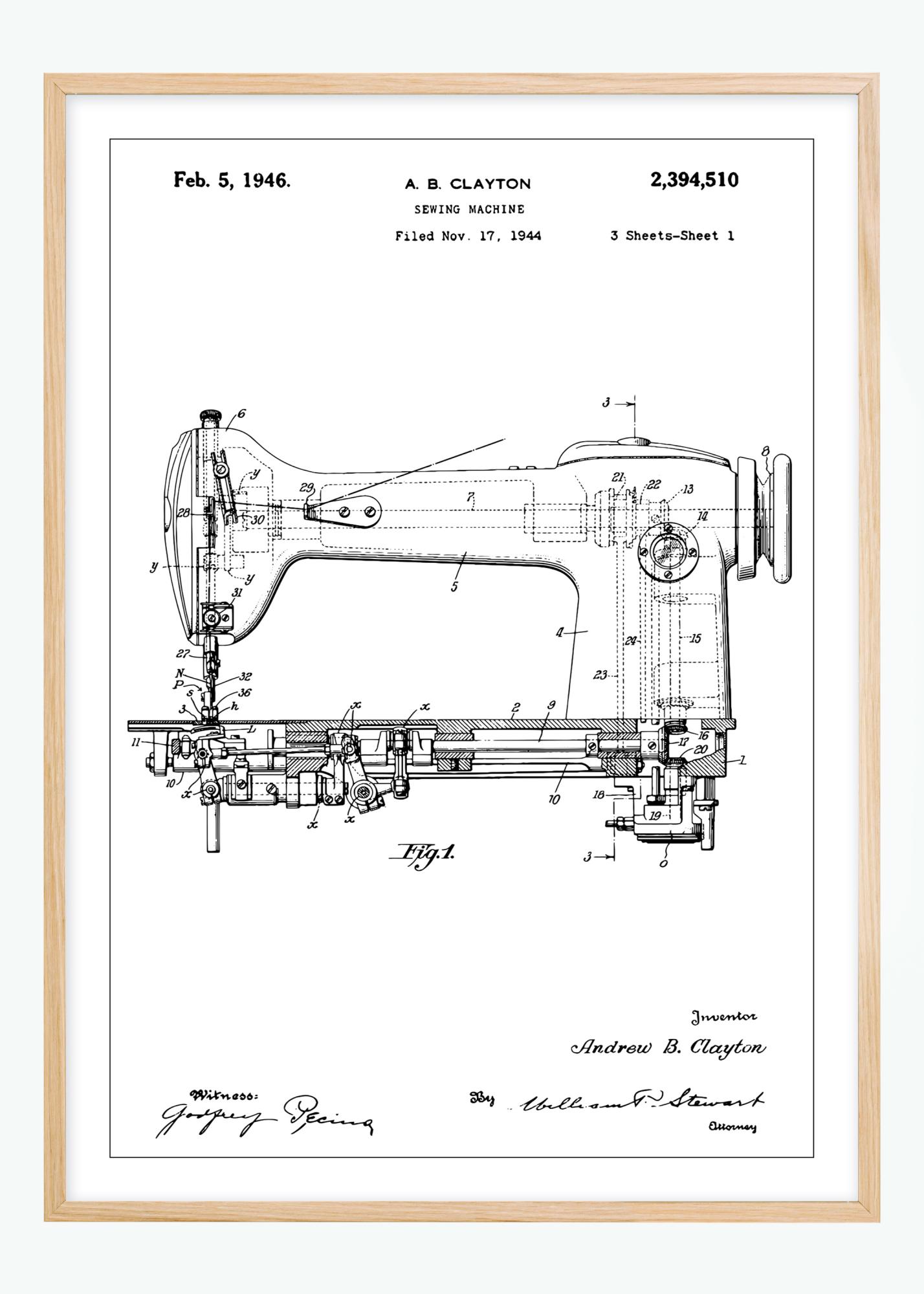 Denne detaljerte patenttegningen av en symaskin er en perfekt illustrasjon av industriell kunst og innovasjon, signert av oppfinneren Andrew B. Clayton. Opphavsrettslig datert til 5. februar 1946 og arkivert den 17. november 1944, fremstiller denne patentplakaten det klassiske håndverket og presisjonen bak maskinell søm. Med dens komplekse komponenter og tekniske linjer, tilbyr denne patentplakaten et unikt innblikk i tidlig 1900-talls teknologiske fremskritt og er en stilfull interiørdetalj for alle som verdsetter historisk innovasjon.