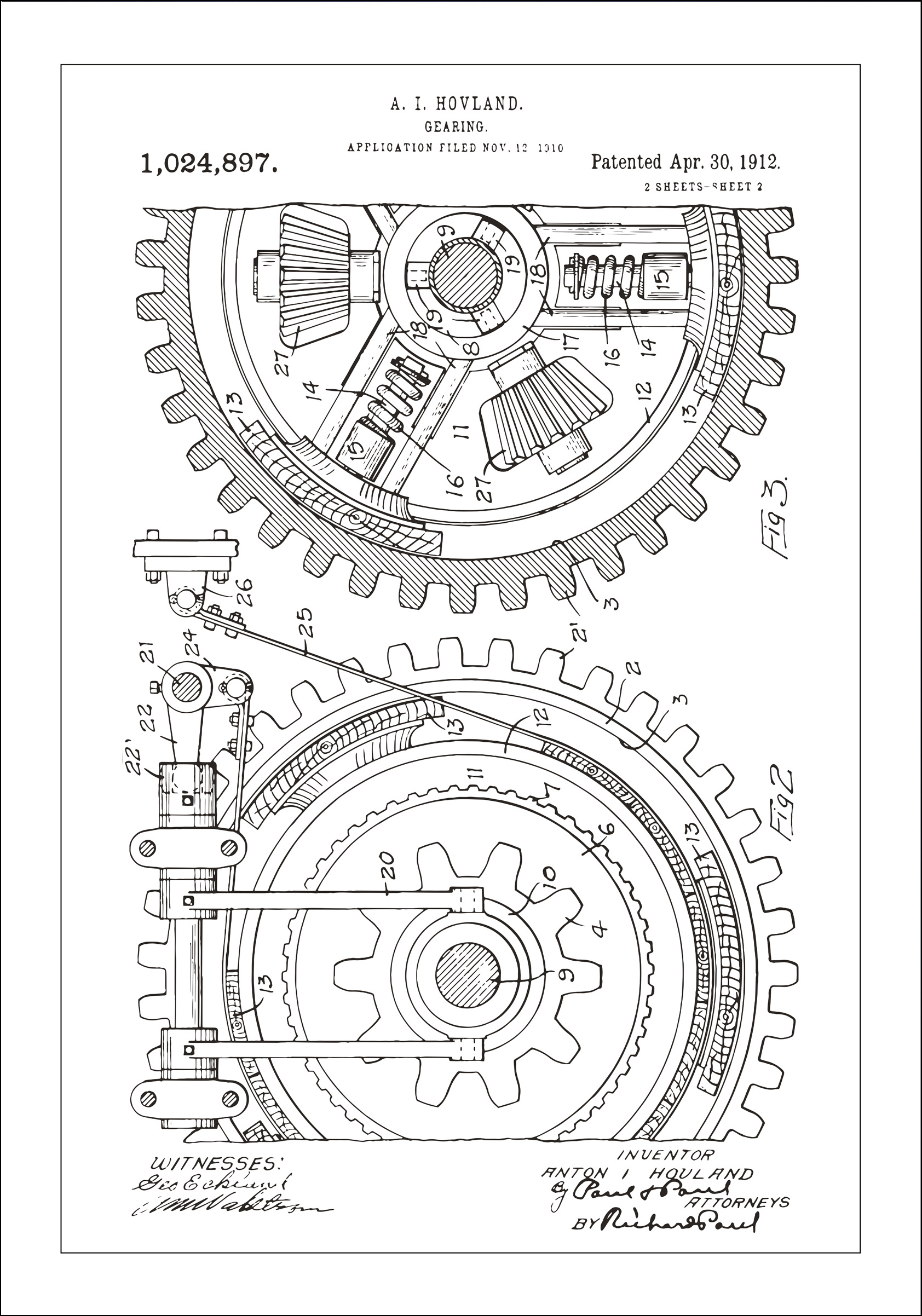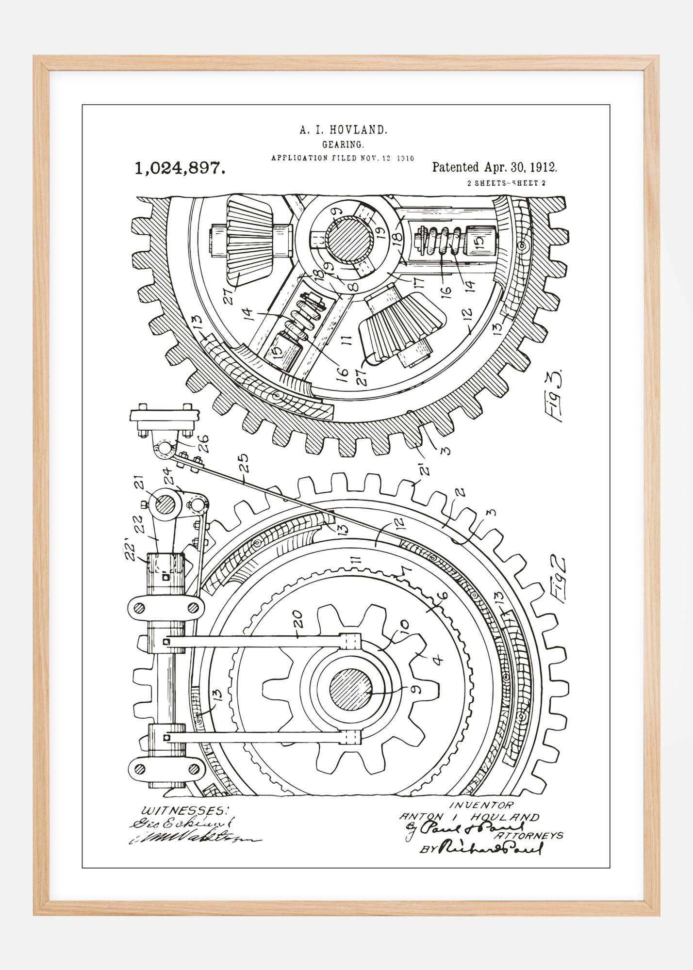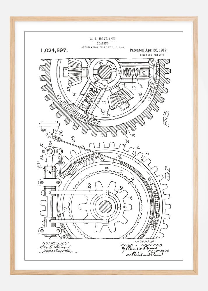 Pynt veggen din med denne klassiske patentplakaten som presenterer A. I. Hovlands intrikate girkassedesign, patentnummer 1,024,897, innvilget den 30. april 1912. Denne detaljerte tegningen fremhever den tekniske dyktigheten og kompleksiteten i tidlige mekaniske konstruksjoner. De elegante linjene og nøye detaljene i denne patentegritningen tilbyr en dypere forståelse for ingeniørkunstens historie og er et storslått komplement til enhver teknisk eller industriell innredningsstil.