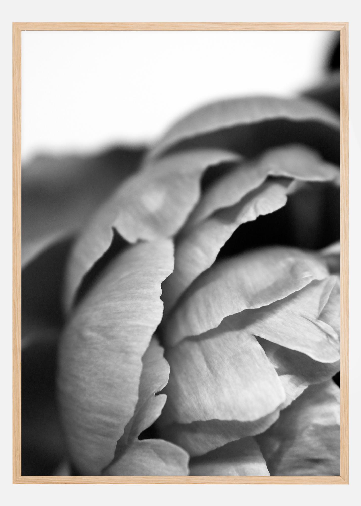 Et nærbilde i svart-hvitt av en peonblomst. De hvite kronbladene kurver grasiøst over hverandre og danner en kållignende struktur. Satt mot en sløret bakgrunn, kan du beundre de perfekt dannede bladene på denne delikate blomsten. En perfekt plakat for alle som elsker blomster.